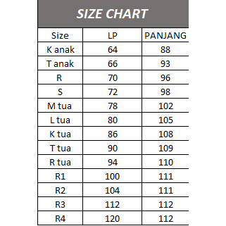 K anak, T anak, R anak, S, M, L, K tua, T tua, R tua, R1 lp 102 pj 110