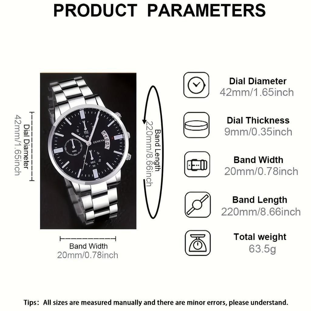 4PCS Jam Tangan Kuarsa Pria Bisnis Skala Romawi Dial Bulat Tali Jam Tangan Stainless Steel Kalung Gelang Gratis (Tanpa K