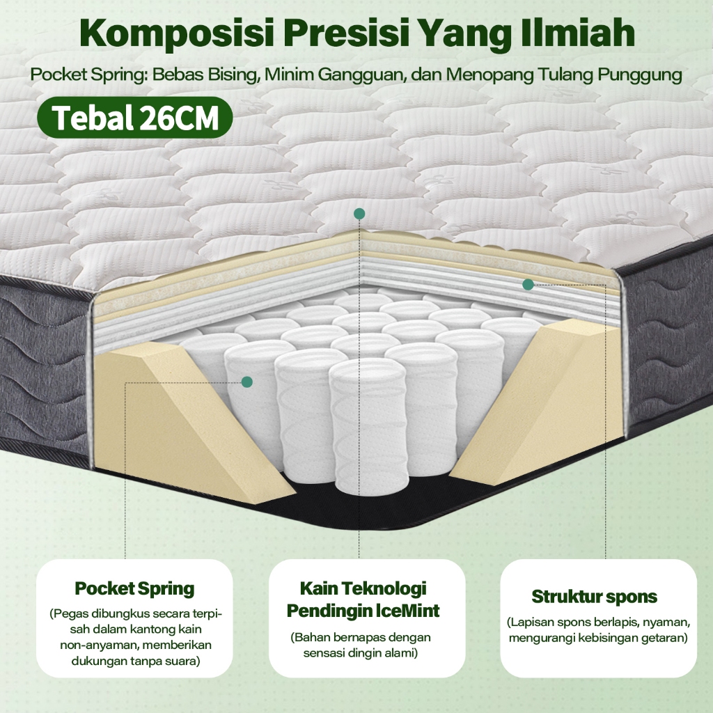 Gratis Bantal Kasur Springbed 20/26cm Tebal Pocket Spring Tanpa Suara Anti Lembab untuk Tidur di Kasur Atau Lantai Kasur Busa 180cm