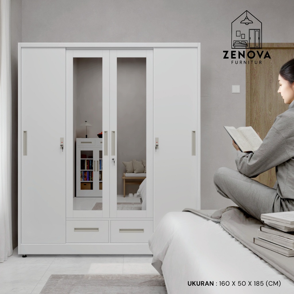 ZENOVA Official Lemari Pakaian Besi 160 Cm 4 Pintu Sliding 1 Hanger 2 Laci Cermin Minimalis