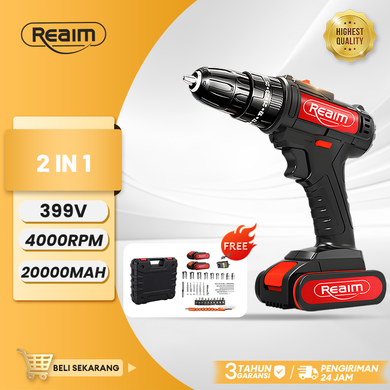 REAIM Mesin Bor Baterai 2IN1 399V Bor Impact & Screwdriver Cordless Ringan untuk Rumah DIY Projects