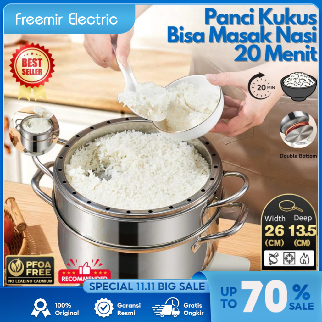 New 2025 freemir electric Panci Susun Kukus Nasi SUS 201 Stainless Steel 25cm Langseng + Steamer