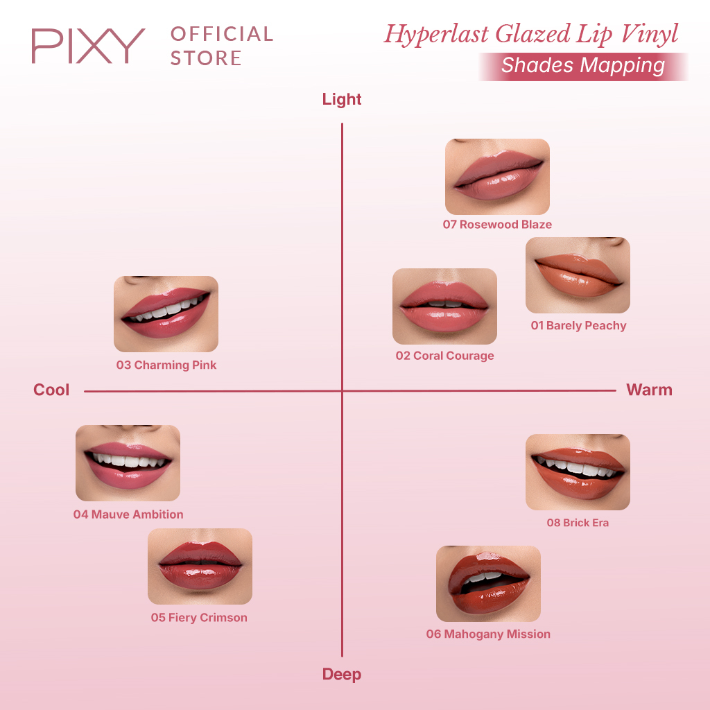 01 Barely Peachy, 02 Coral Courage, 03 Charming Pink, 04 Mauve Ambition, 05 Fiery Crimson, 06 Mahogany Mission, 07 Rosewood Blaze, 08 Brick Era