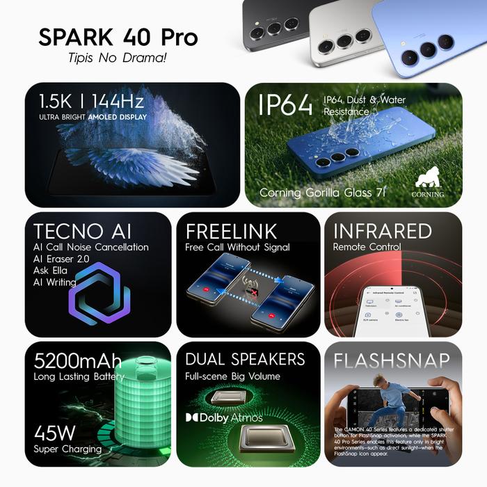 TECNO SPARK 40 Pro - 8+8GB*/128GB, 1.5K & 144Hz AMOLED Display, Ultra Thin Body, Mediatek Helio G100 Ultimate, 5200mAh