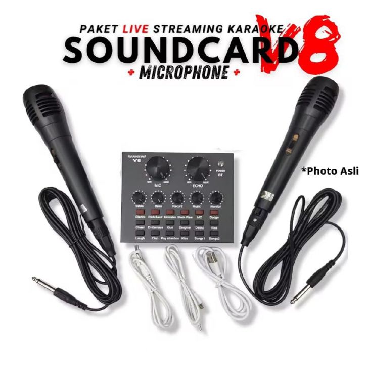 TERMURAH Paket Live Pemula 3 pcs Soundcard v8 Gratis 2 Microphone Colokan Besar Karaoke Soundcard Singing Audio