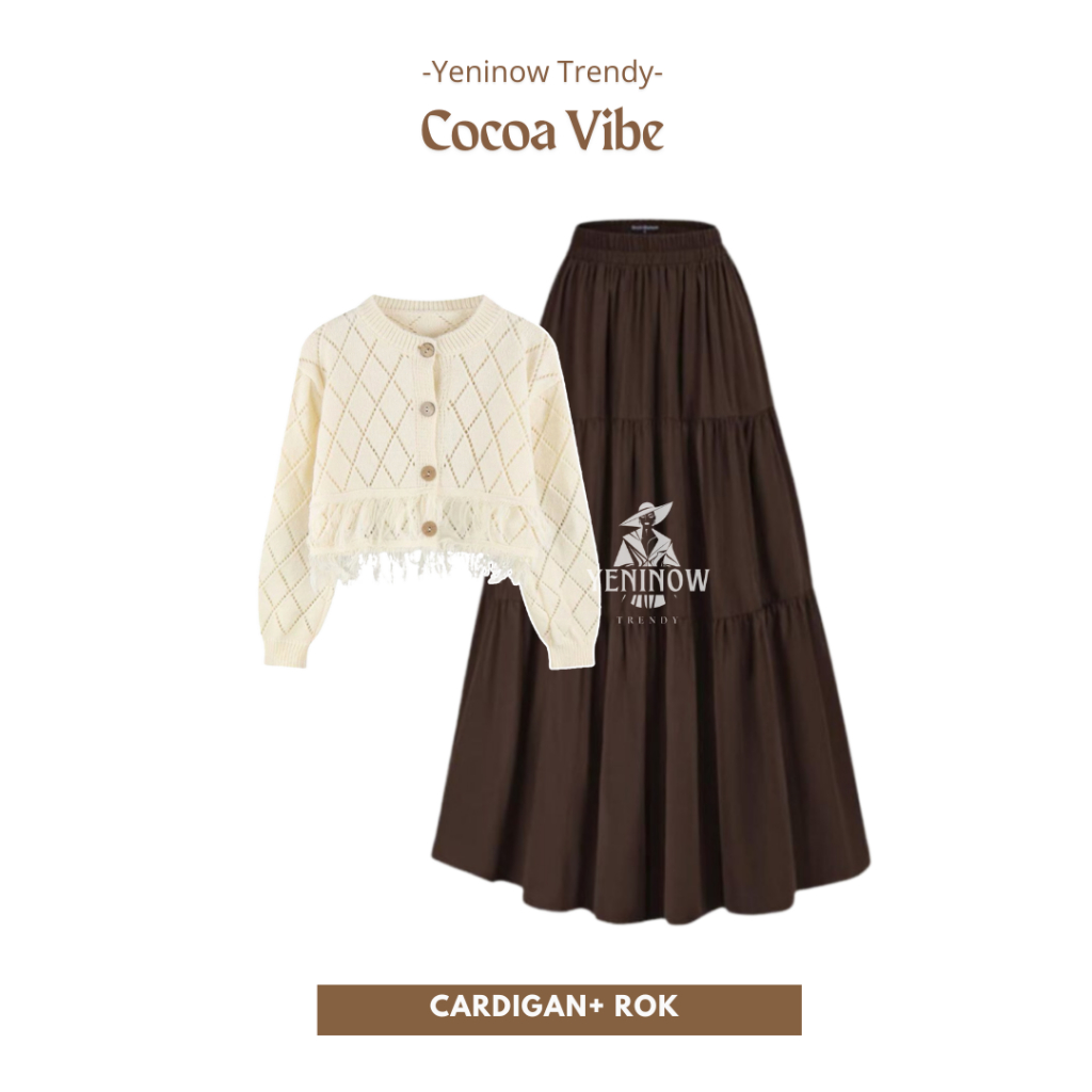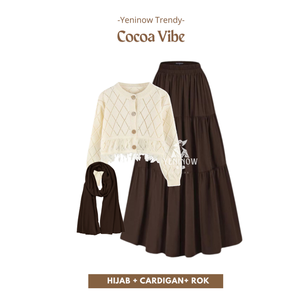 Cocoa Vibe One Set Hijab Style Cardigan Rawis, Rok Susun Coklat, Jilbab Pashmina Kaos Jersey Setelan Wanita Kekinian Out
