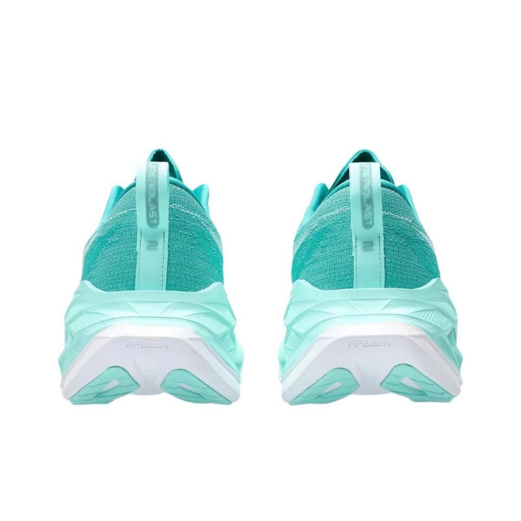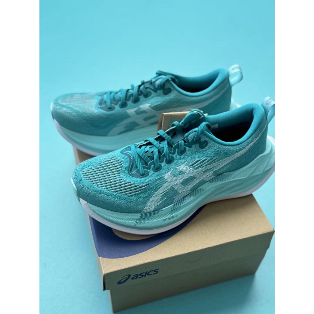 Sepatu lari pria dan wanita ASICS hijau mint, dilengkapi dengan teknologi FF Turbo+, cocok untuk lari di jalan raya
