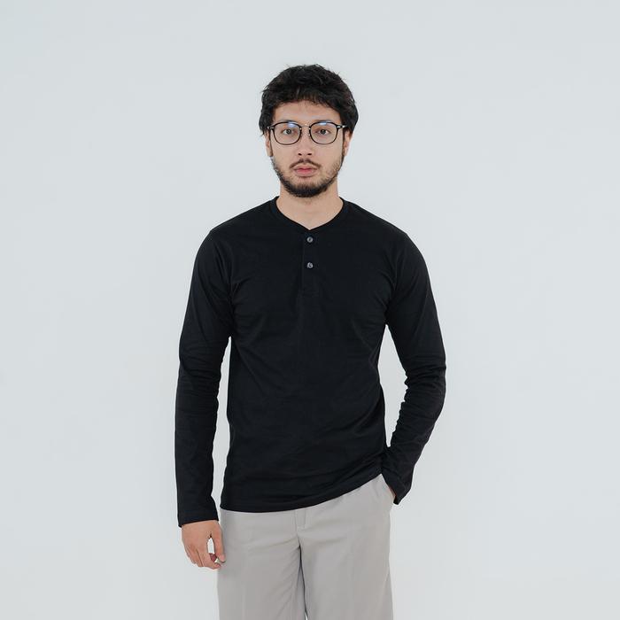BAJU HENLEY LONG SLEEVE COTTON COMBED 24S BLACK - KAOS KATUN POLOS HENLEY BERKANCING LENGAN PANJANG PRIA - S