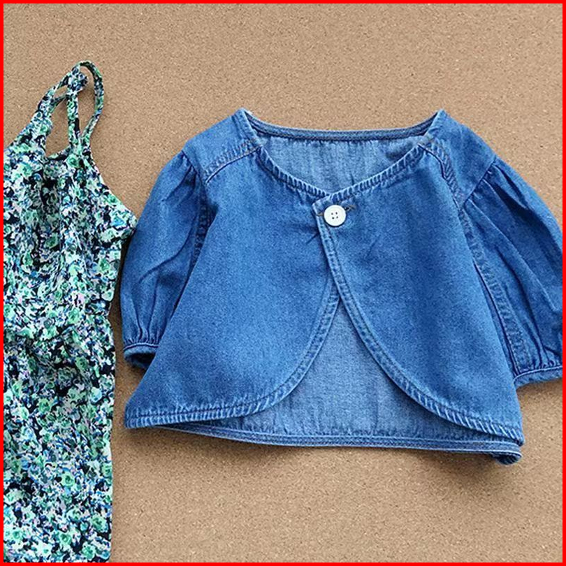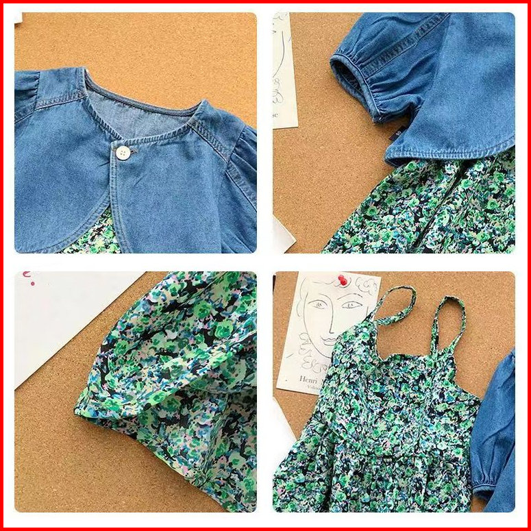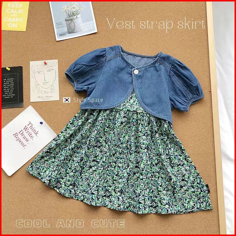 Kf Cat Dress Anak Perempuan Lengan Pendek 2in1 Bahan Katun Jeans Korea Style Usia 1-4 Tahun