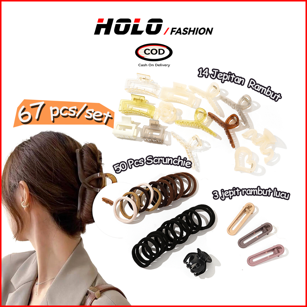 Holo Jepitan Rambut Ikat Rambut Cewek 67 Pcs 1 Set Gratis 50 Pcs Scrunchie Aksesoris Rambut