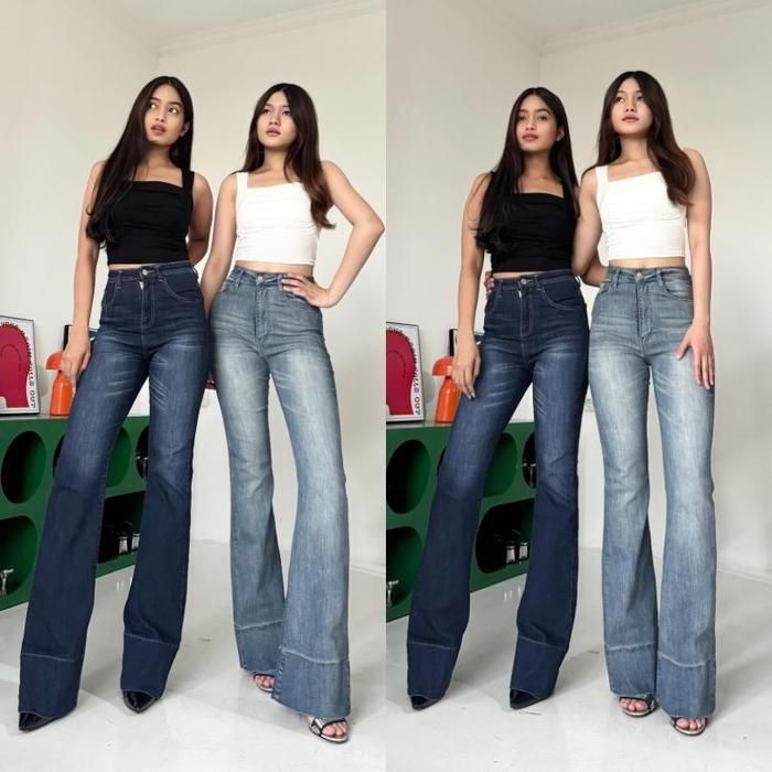 LADOUCE - MCKENZIE HIGH WAIST CUTBRAY JEANS CELANA FLARE PANJANG STRETCH WANITA - GREY-ISH BLUE SHORT, 27