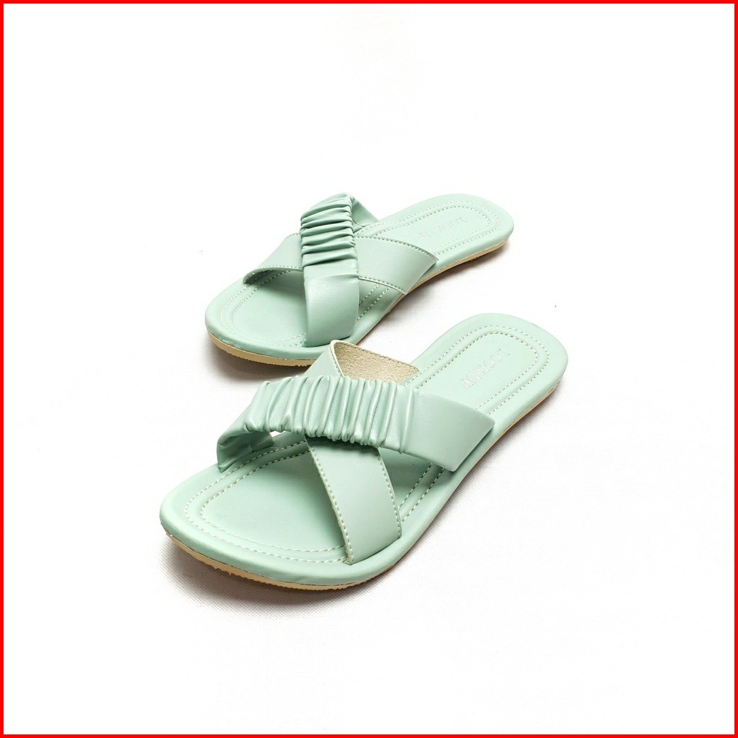 Urania Look Up Sandal Kulit Wanita Flat Teplek Strap Silang Paster Color Mocca Ruffle Flat Series
