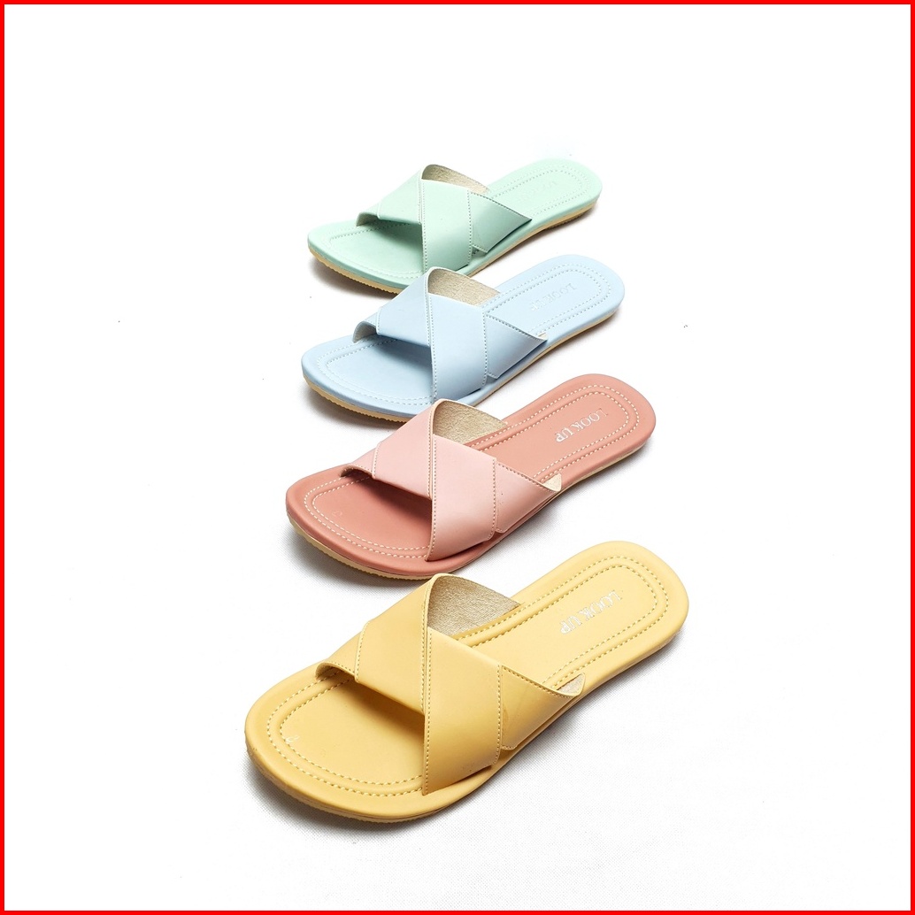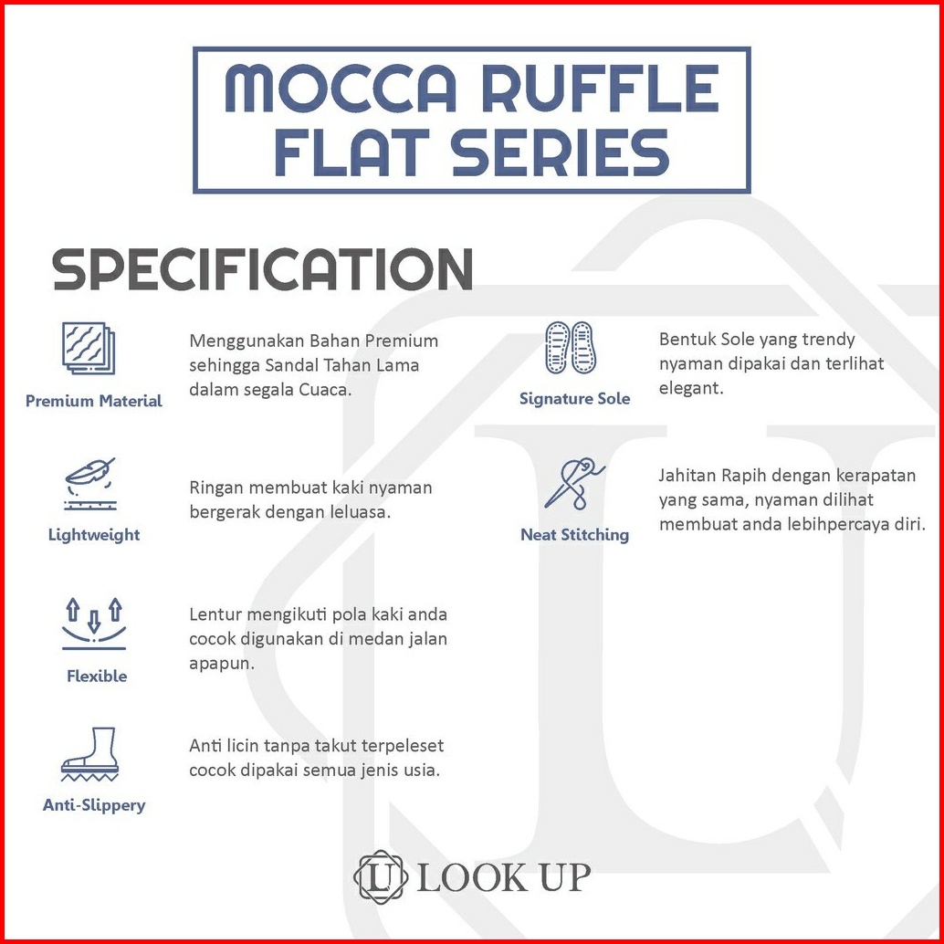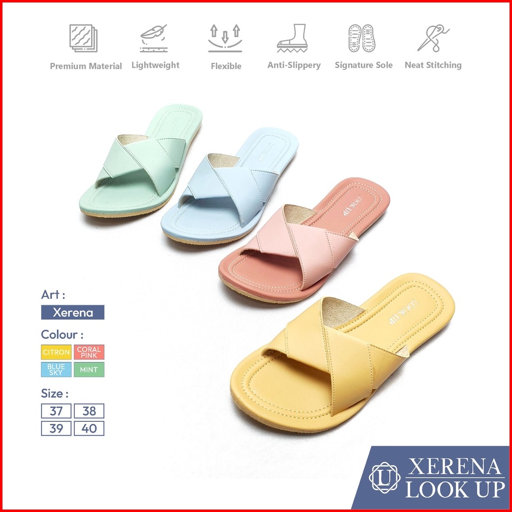 Xerena Look Up Sandal Kulit Wanita Flat Teplek Kokop Pita Paster Color Mocca Ruffle Flat Series