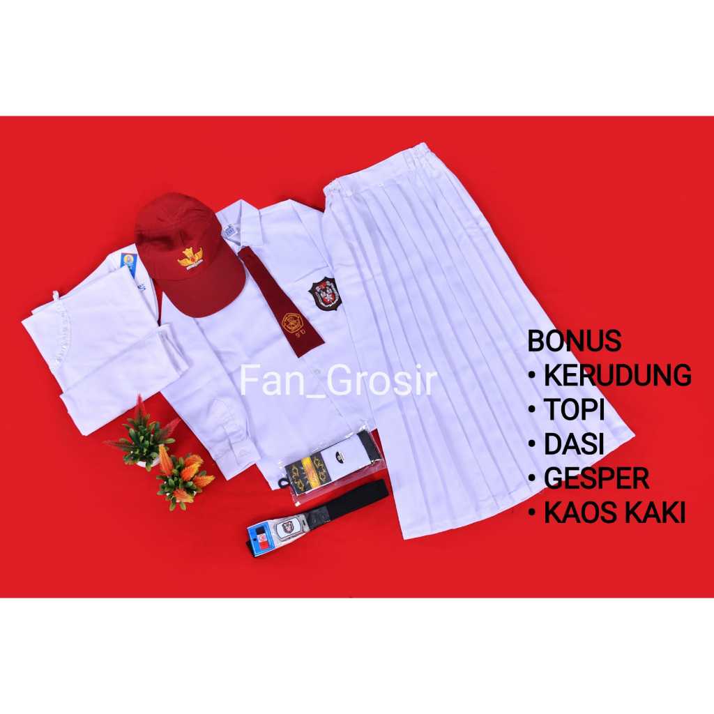 SERAGAM SEKOLAH SD ANAK PEREMPUAN PANJANG KELAS 1 - 6 BONUS KERUDUNG TOPI DASI KAOS KAKI SABUK