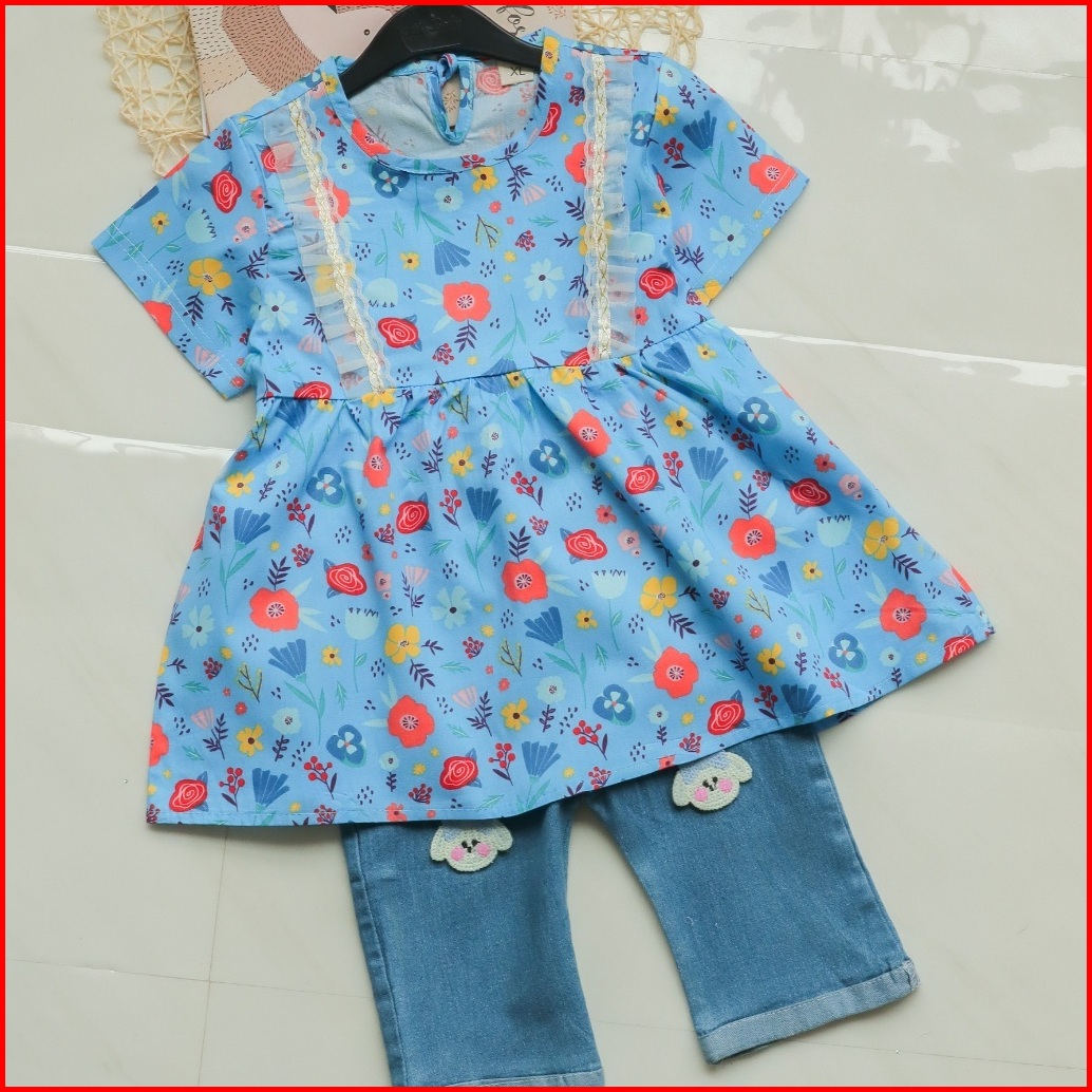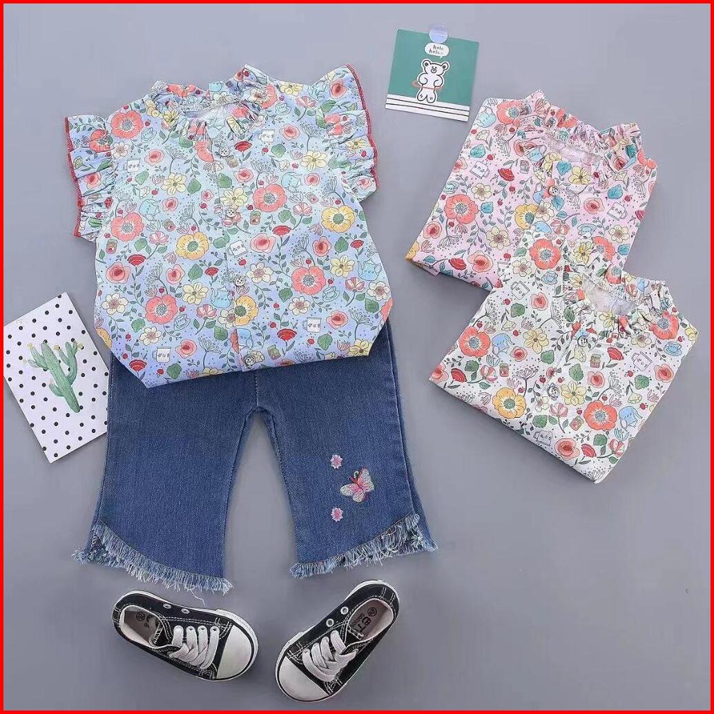 Kf Cat Setelan Baju Anak Perempuan Lengan Pendek Bahan Katun Jeans Casual Style Usia 1-4 Tahun