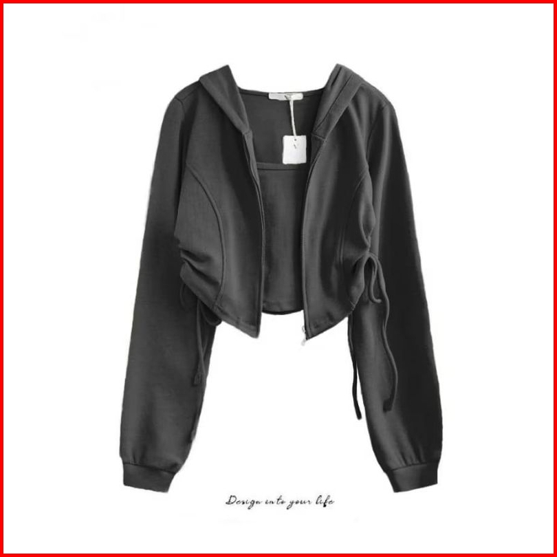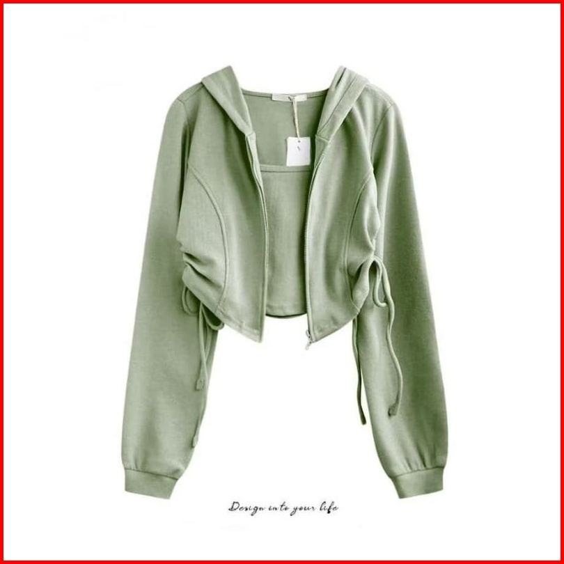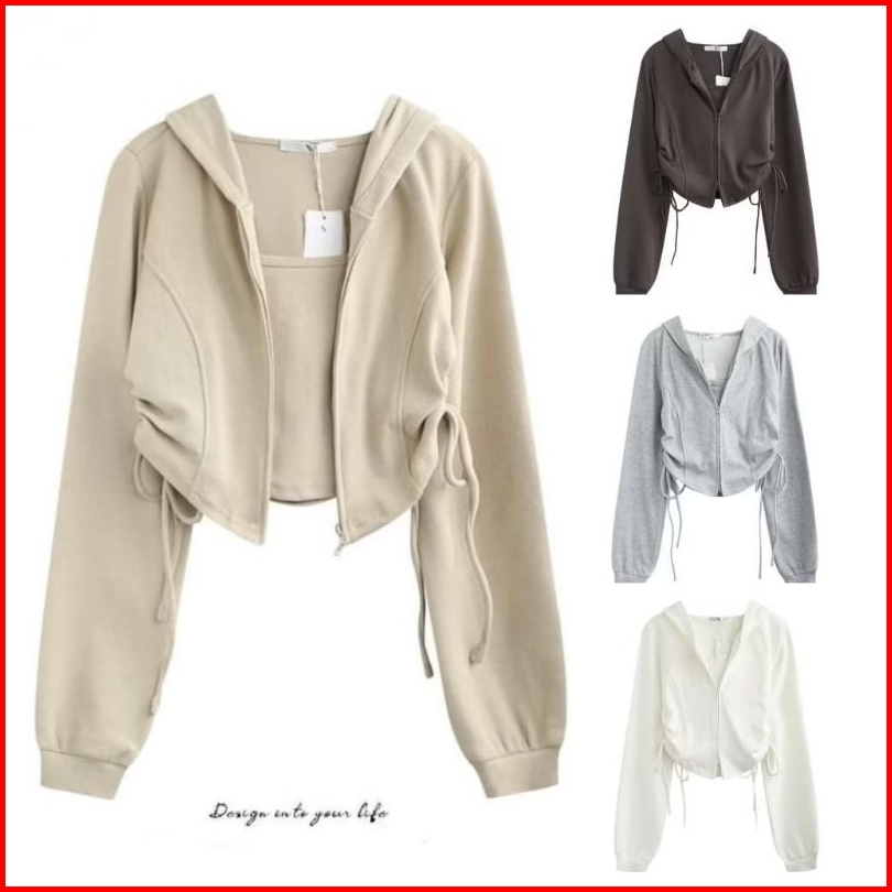 Adella Crop Jaket Polos Wanita Model Tali Serut Sweater Atasan Hoodie Zipper Wanita Kekinian