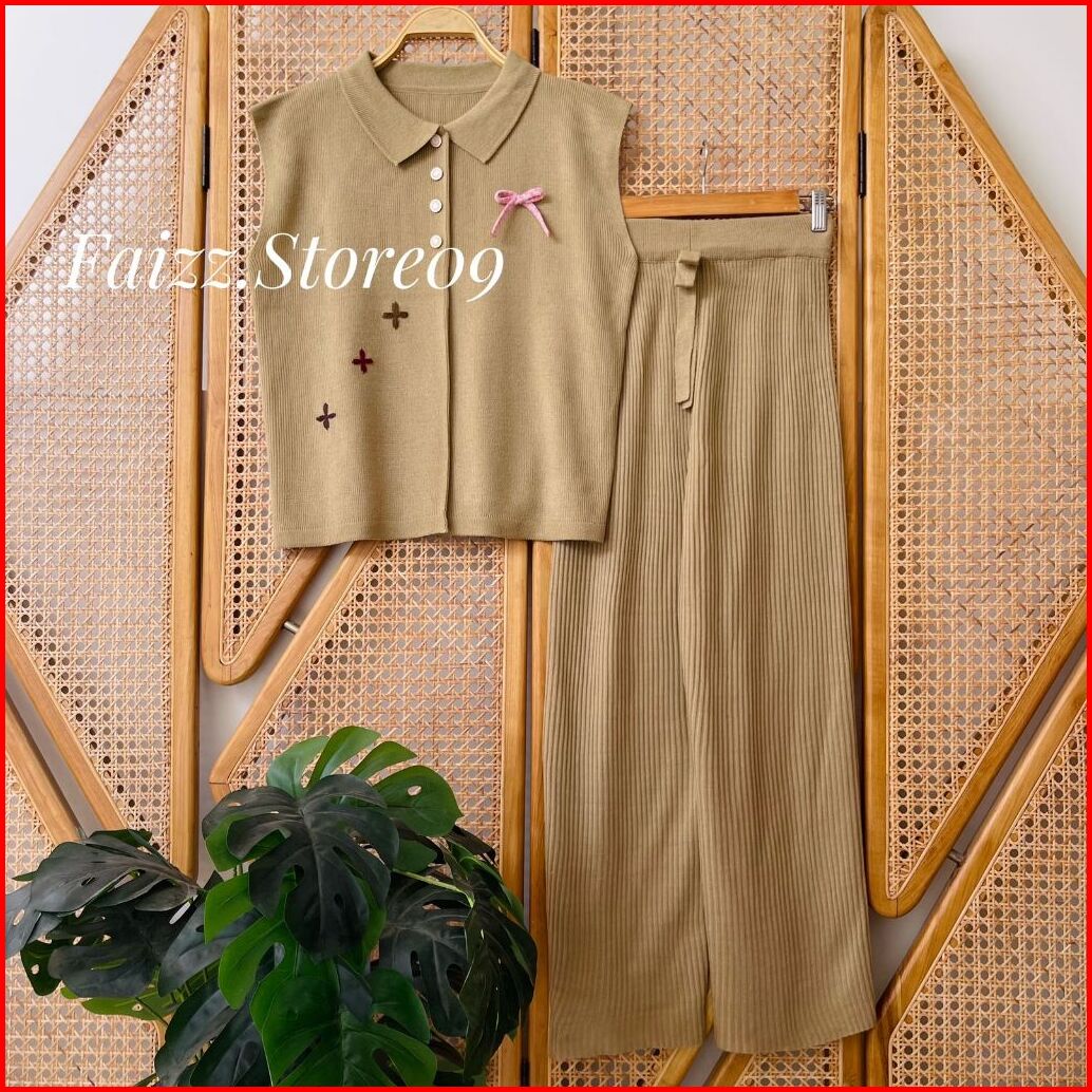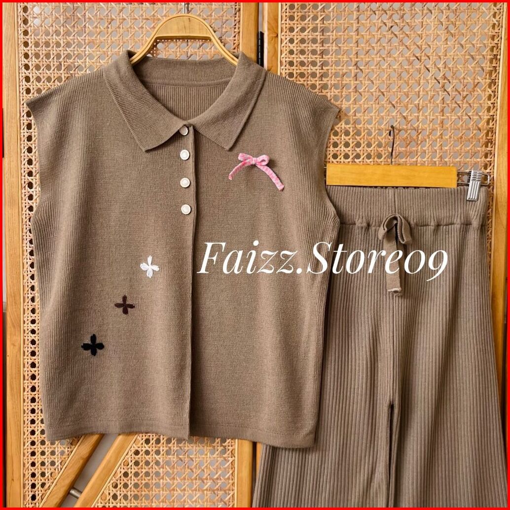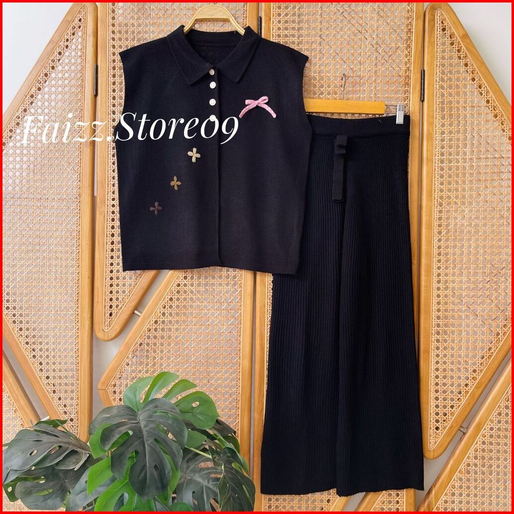 Oneset Auraa Vest Rompi Rajut Kerah Polo Kancing Motif Bunga Pita Setelan Celana Kulot Premium Wanita Kekinian