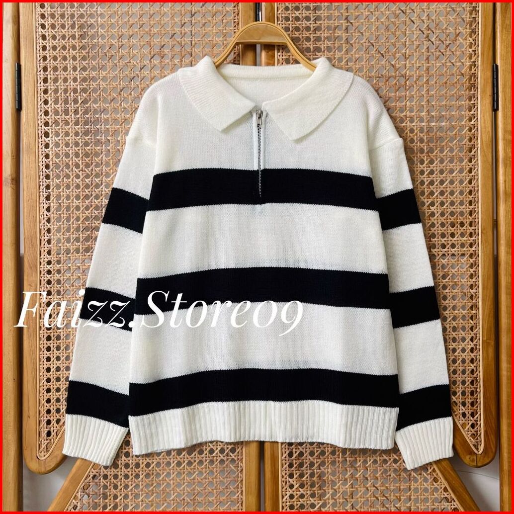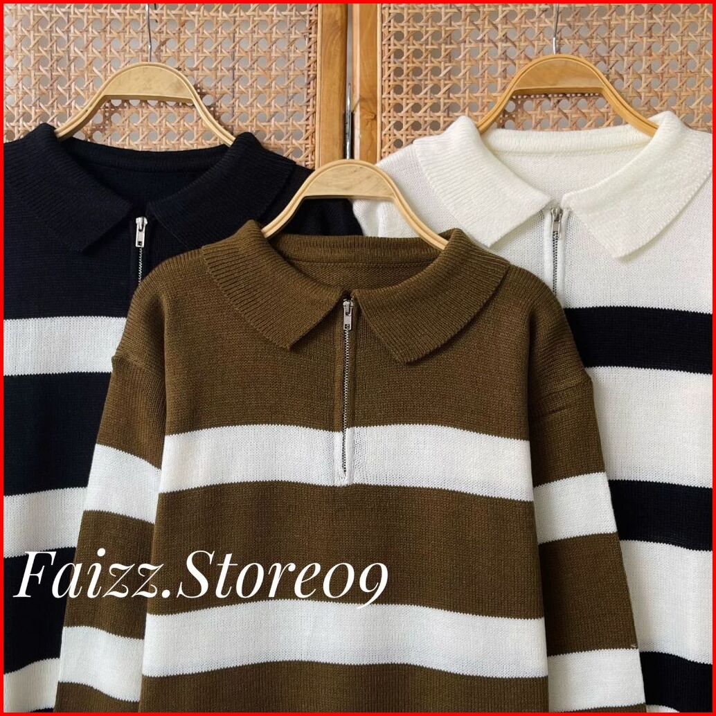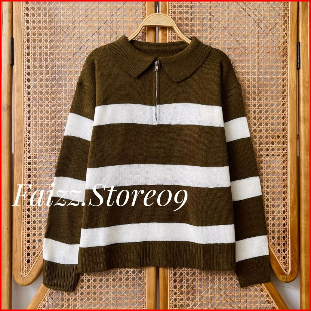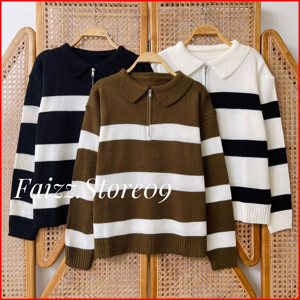 Aisma Knit Zipper Kerah - Atasan Sweater Rajut Wanita Motif Stripe Blaster Resleting Korean Style Premium