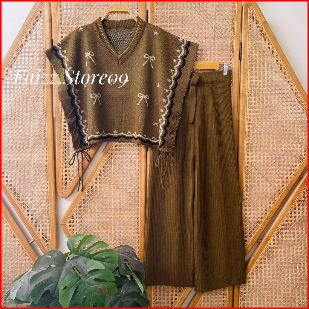 Oneset Ayundi Vest Rajut Wanita Kerah V Motif Pita Talikur Setelan Celana Kulot Premium Wanita Kekinian