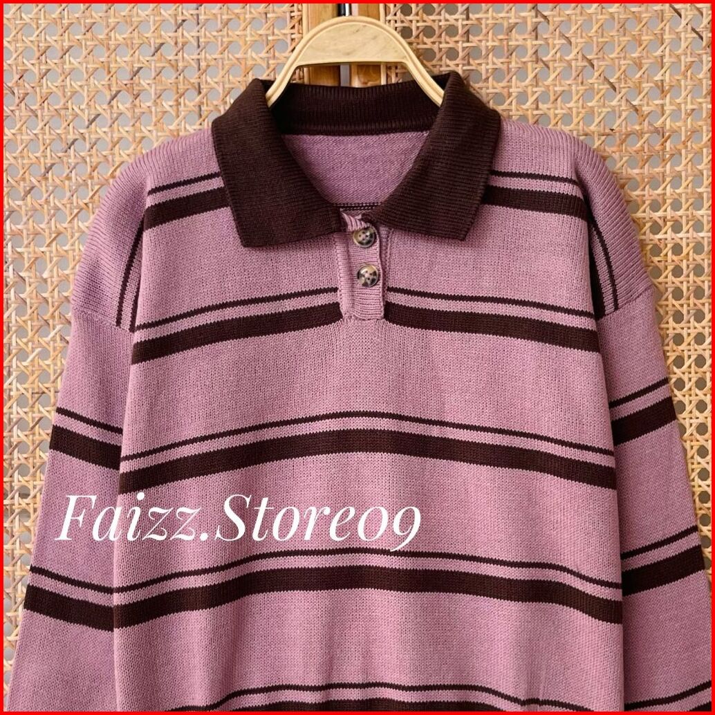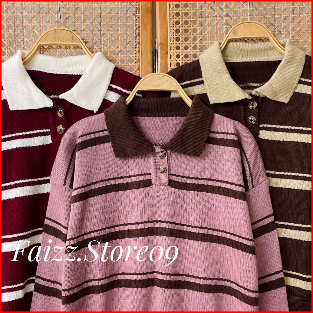 Pandoit Blouse Knit Kerah Polo Kancing - Atasan Sweater Rajut Wanita Motif Stripe Korean Style Premium
