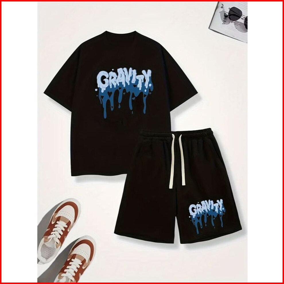 Stelan Baju Dan Celana Pendek Santai Pria Motif Gravityblue Boxer Katun Flecee Kaos Oblong Atasan