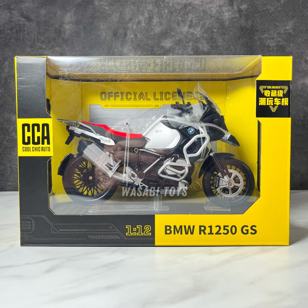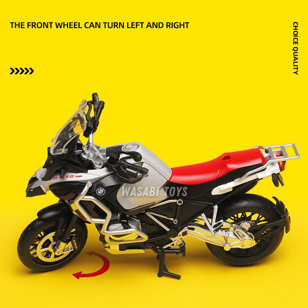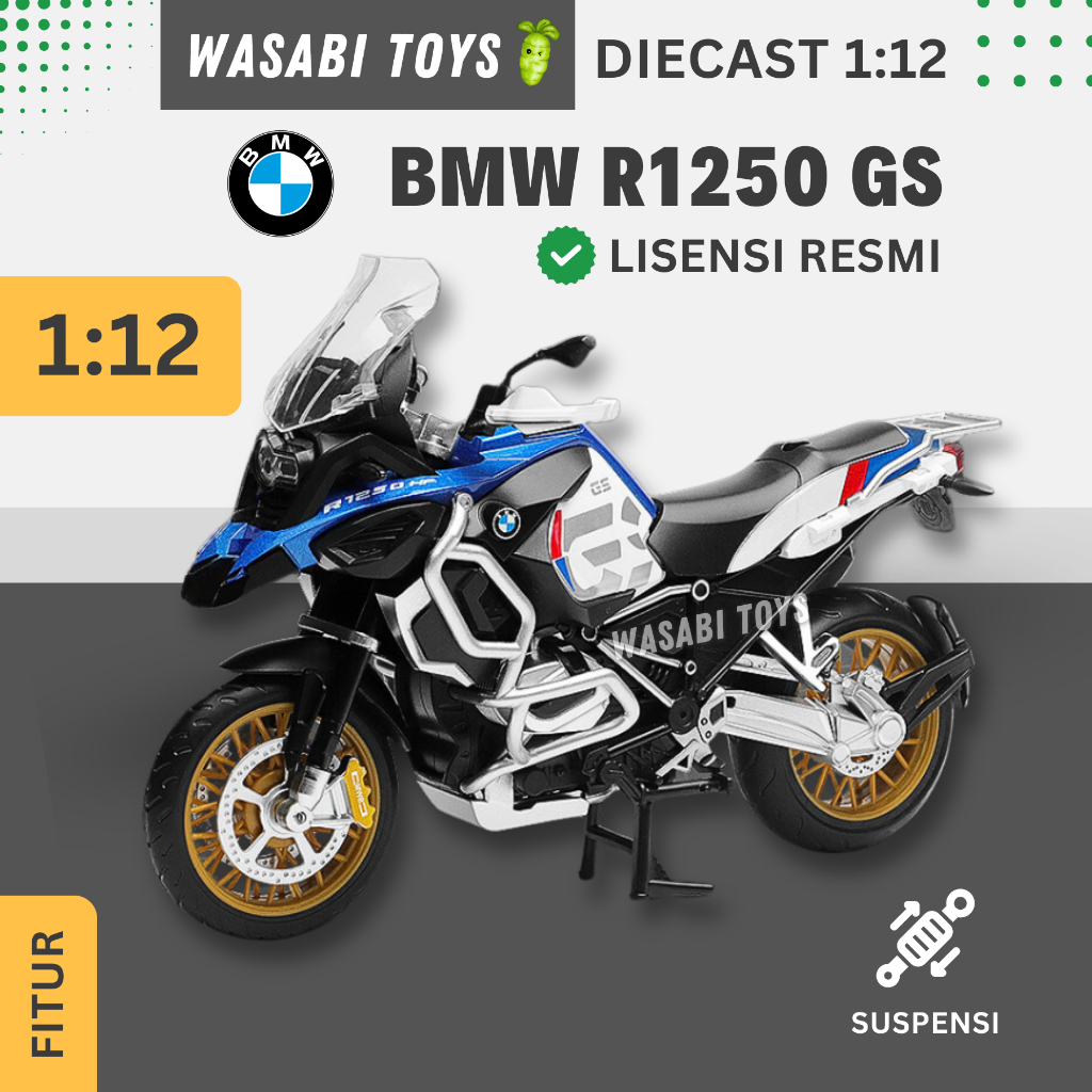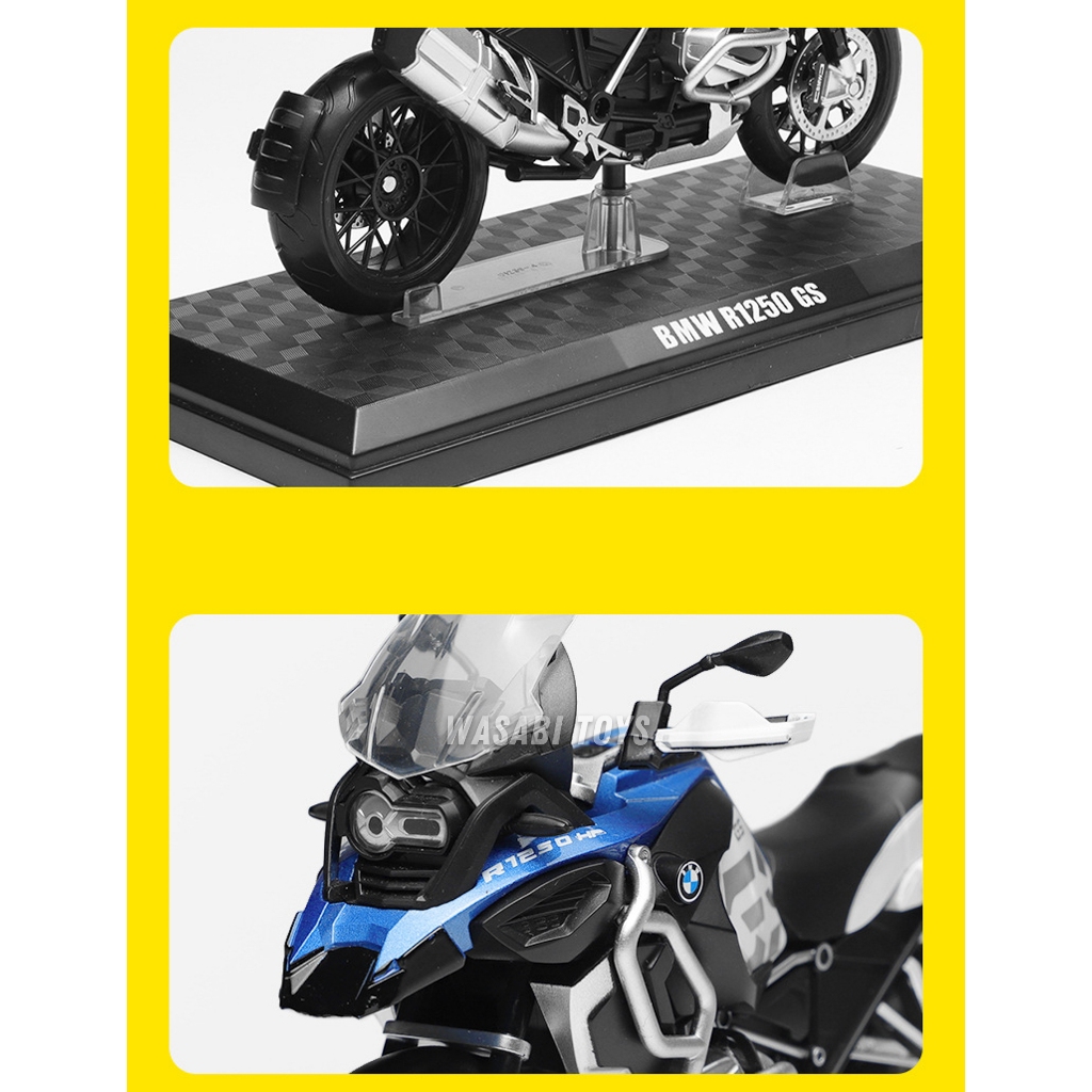 Diecast 1:12 Motor BMW R1250 GS (Dapat Alas Dudukan, Tanki Bensin Logam, Ban Karet, Shock Breaker)