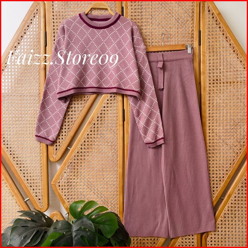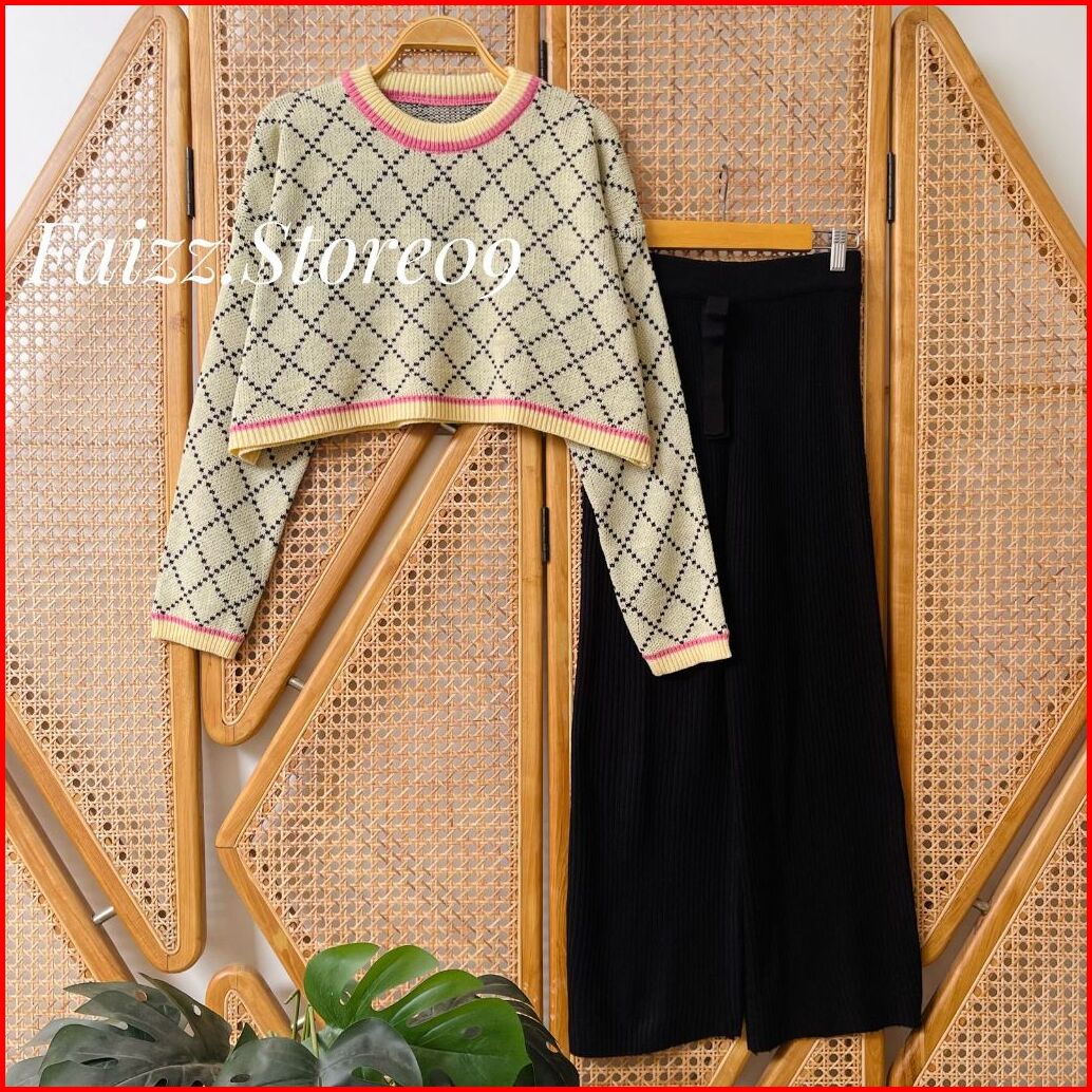 Oneset Eliana Sweater Rajut Motif Sido Kotak Setelan Celana Kulot Premium Wanita Lengan Panjang Kekinian