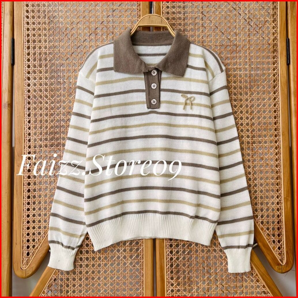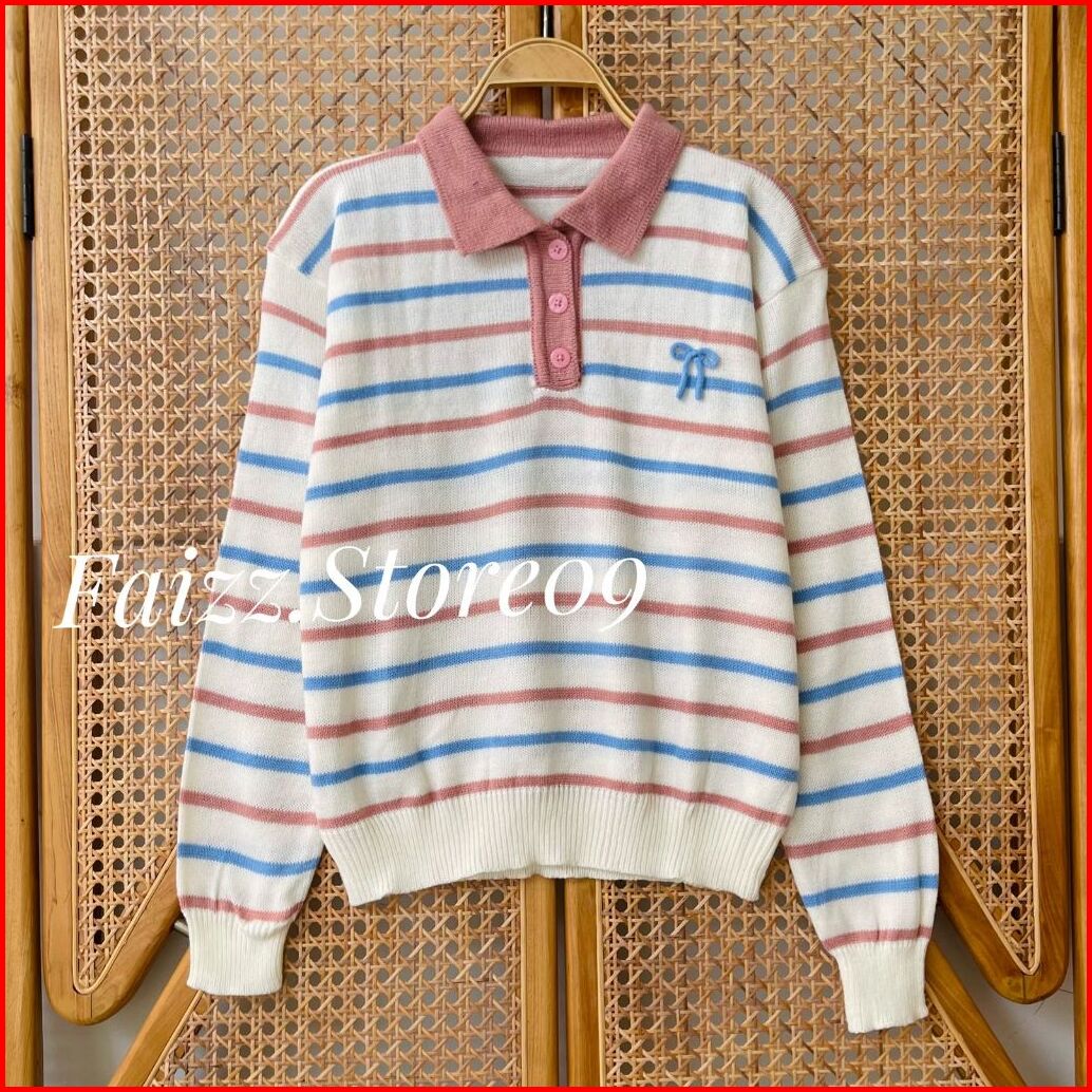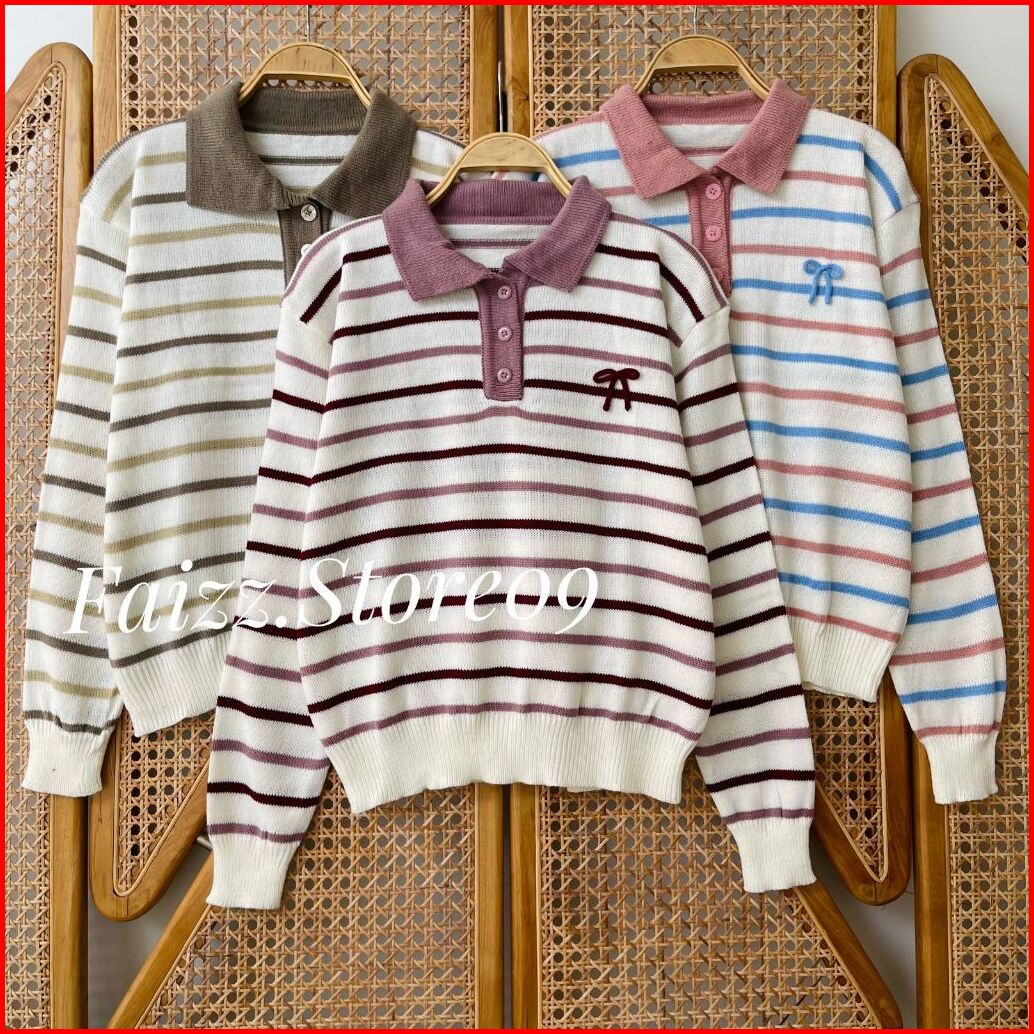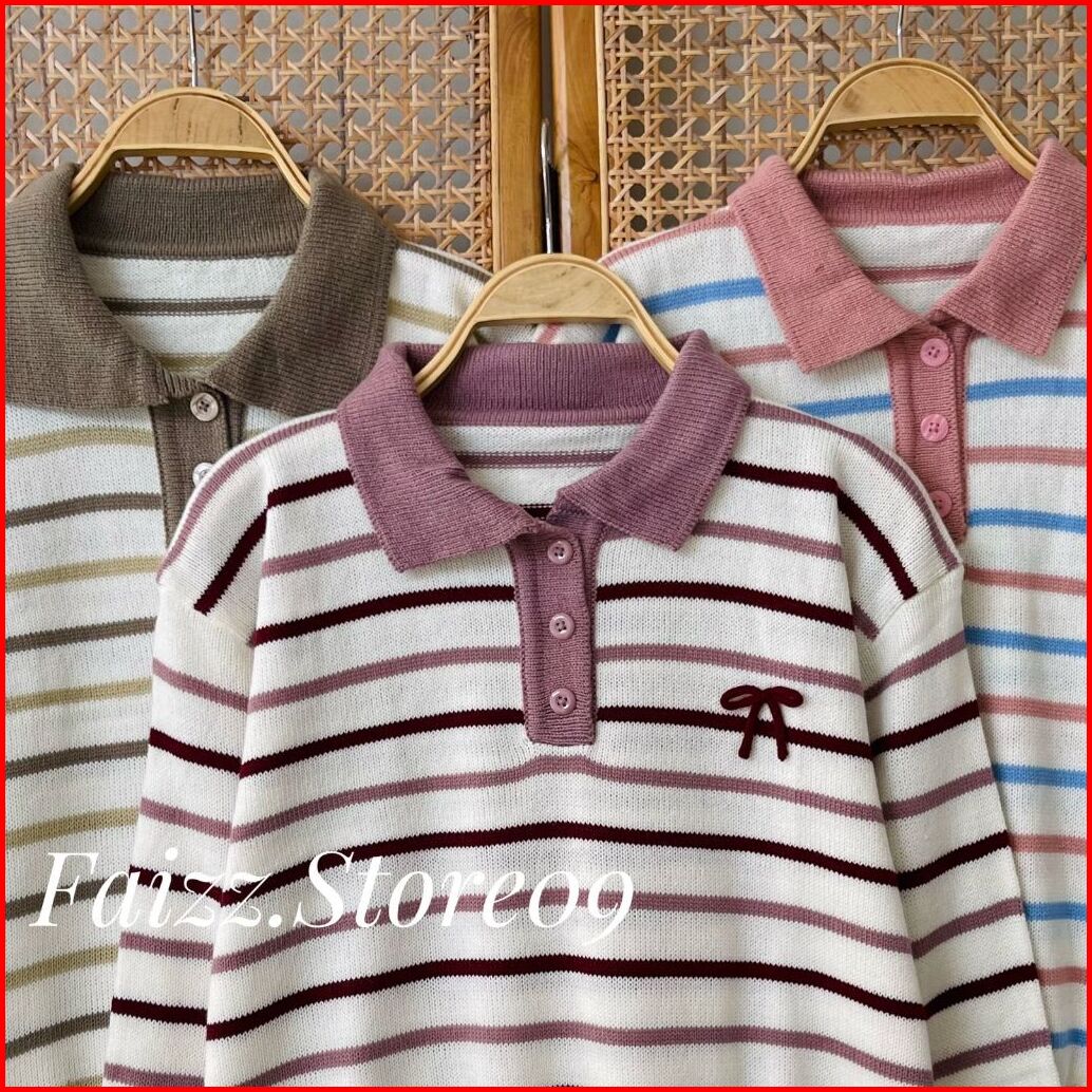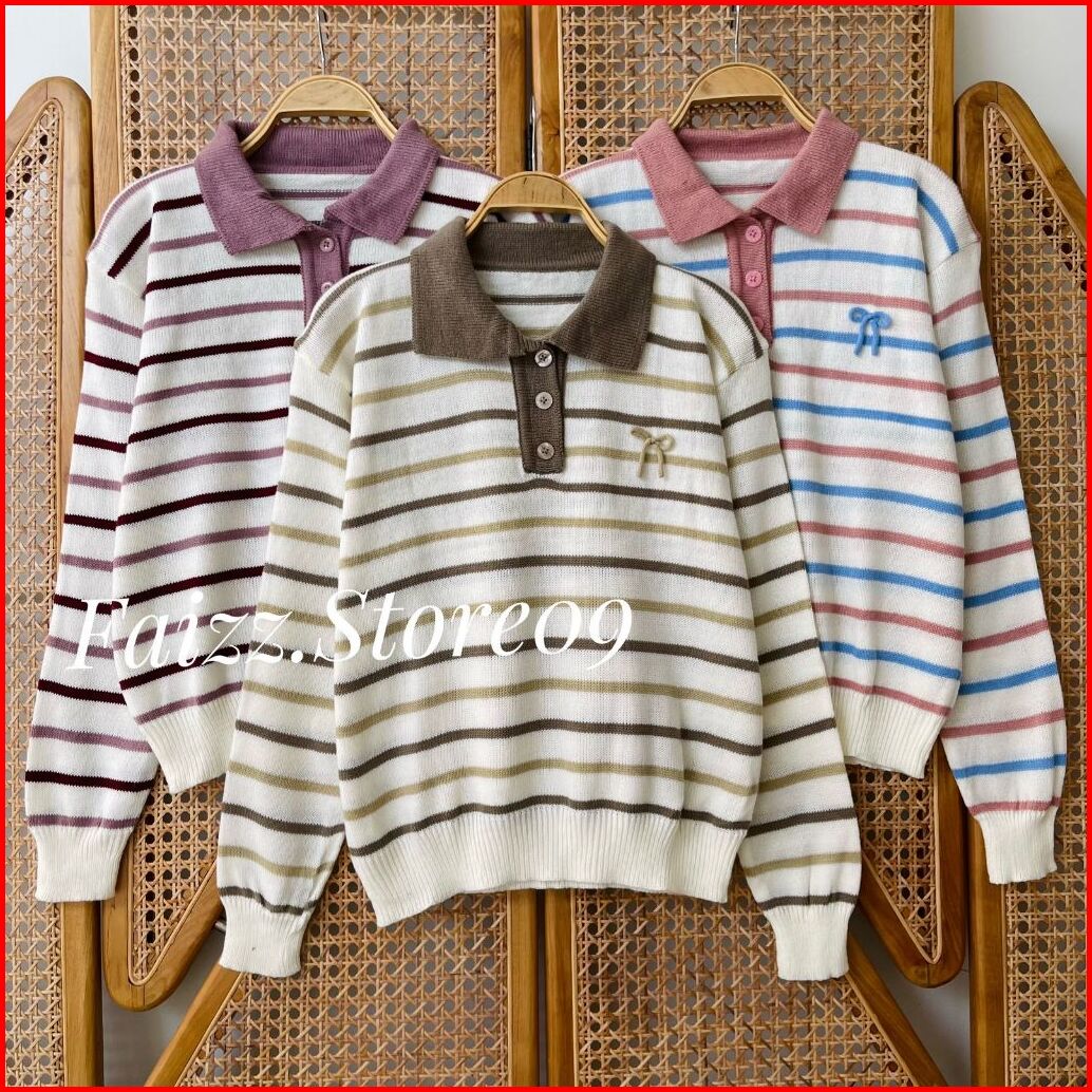 Atisanah Blouse Knit Kerah Polo Kancing - Atasan Sweater Rajut Wanita Motif Pita Stripe Korean Style Premium