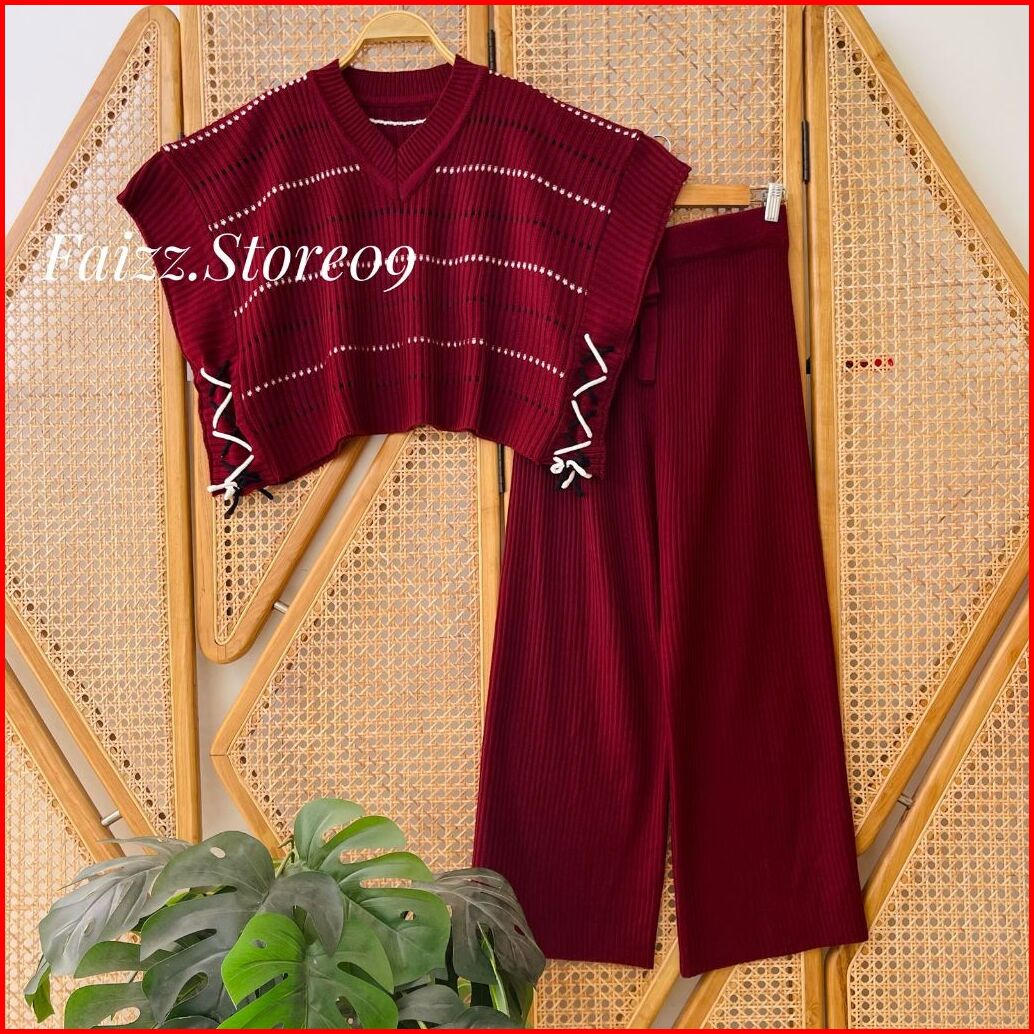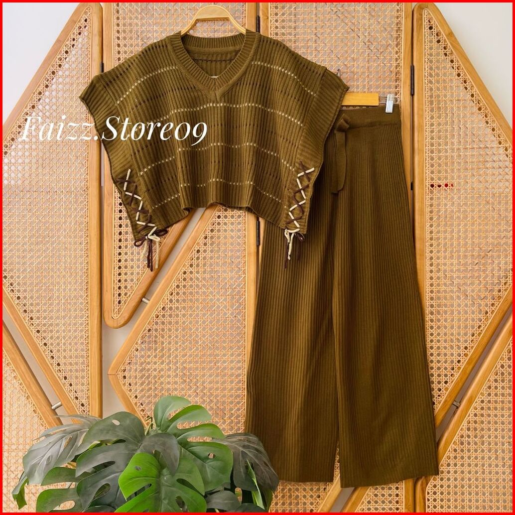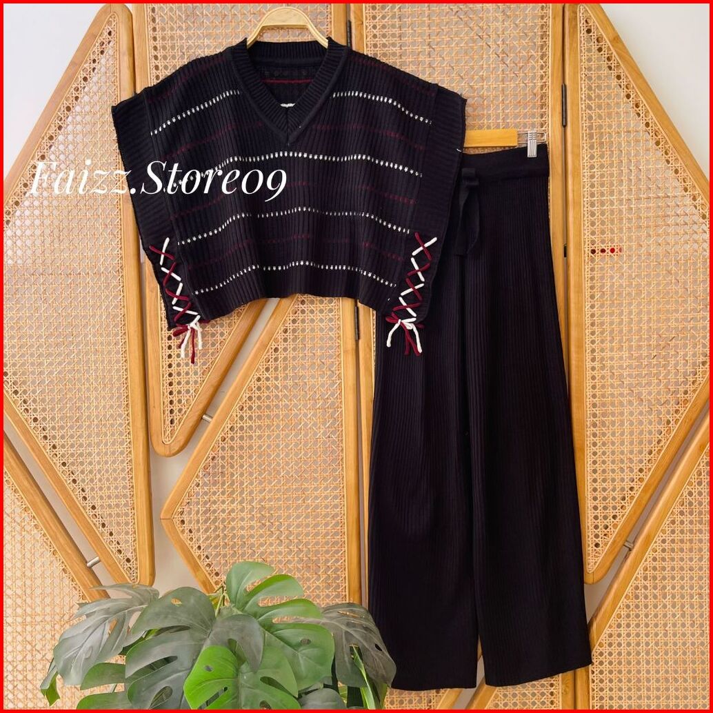 Oneset Adelina Vest Rompi Rajut Motif Stripe Tali Kur Samping Setelan Celana Kulot Premium Wanita Kekinian