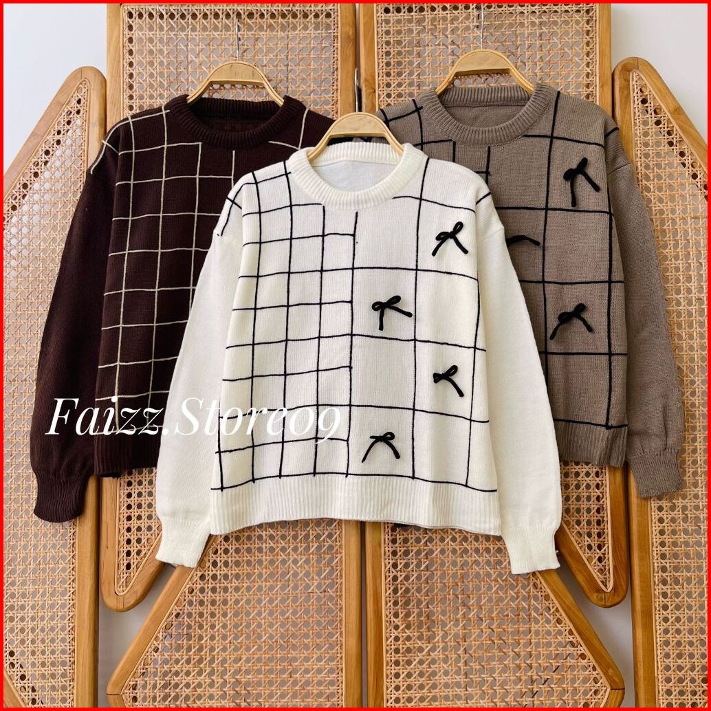 Hairunn Blouse Knit - Atasan Sweater Rajut Crop Wanita Motif Kotak Pita Kerah Bulat Lengan Panjang Korean Style