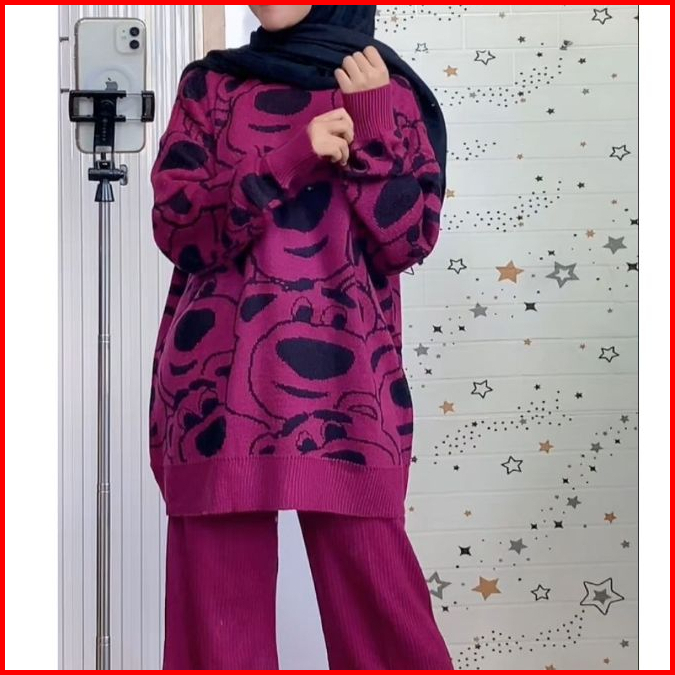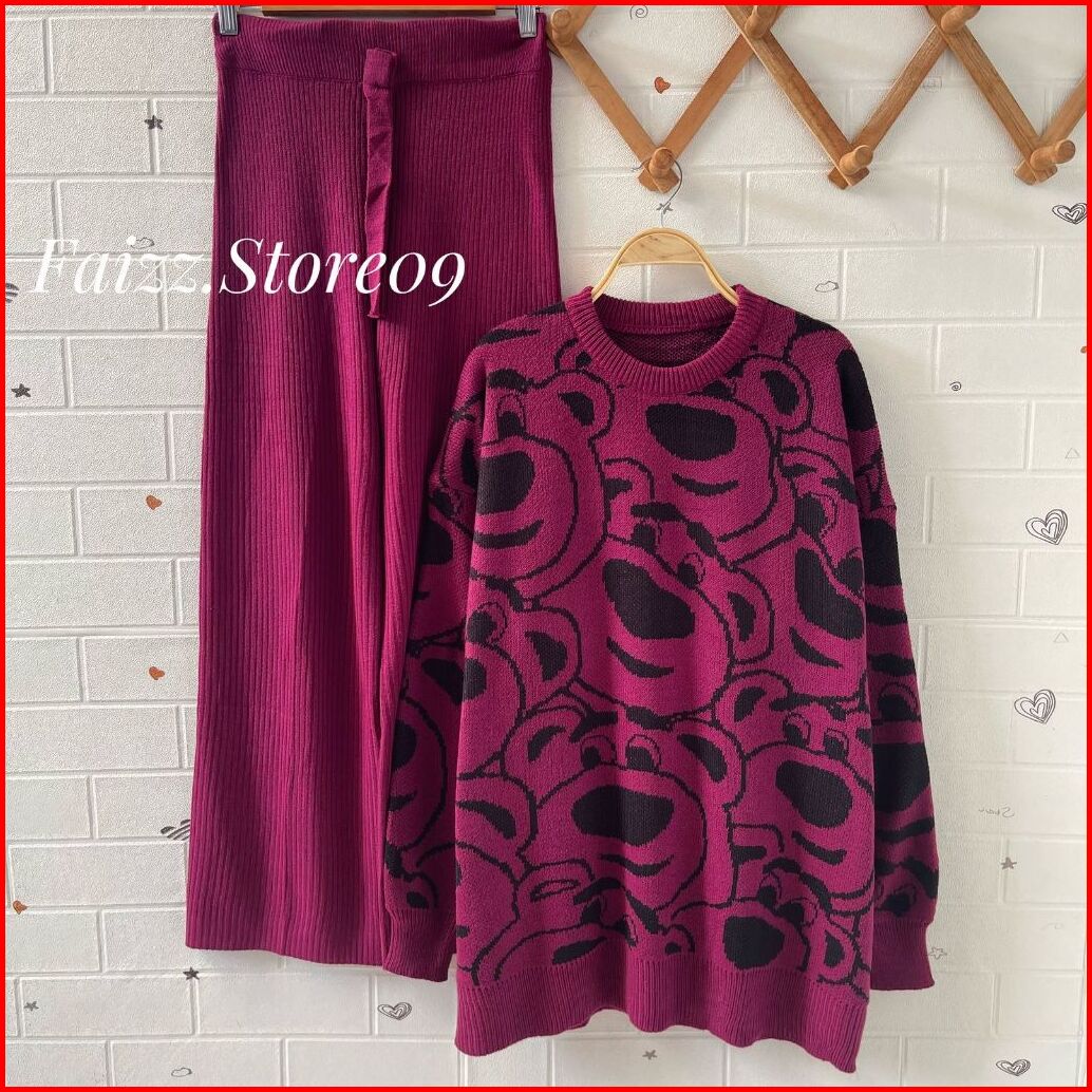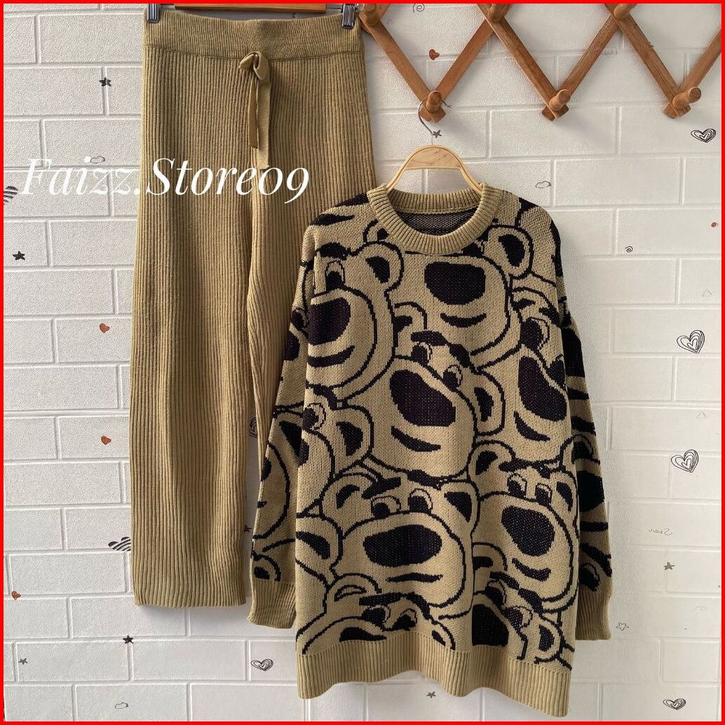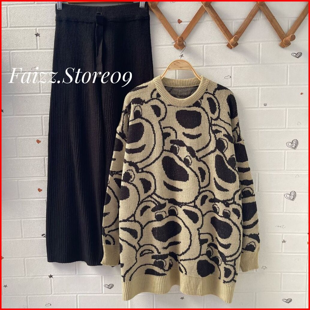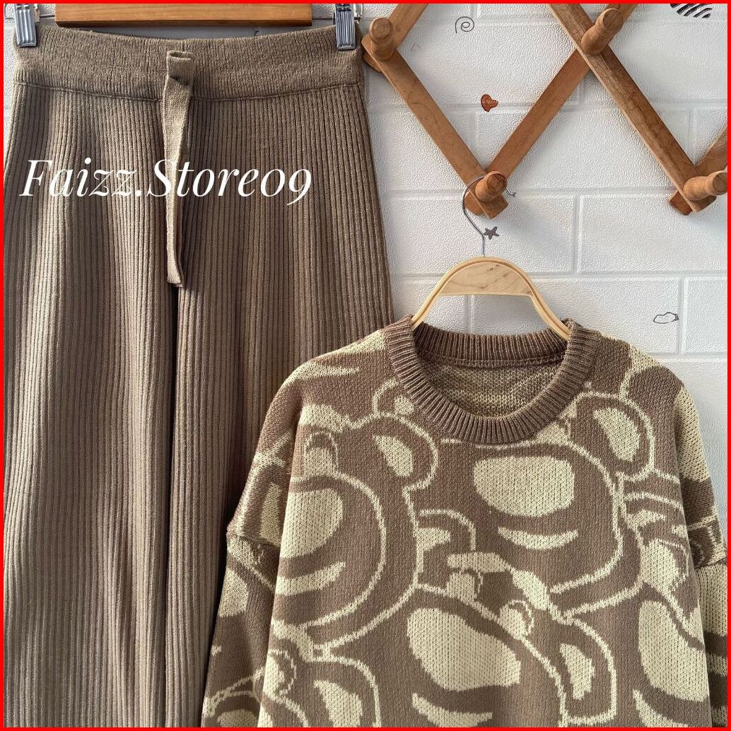 Oneset Sweater Rajut Aramun Motif Bernard Setelan Celana Kulot Premium Wanita Kekinian