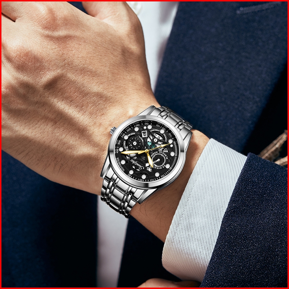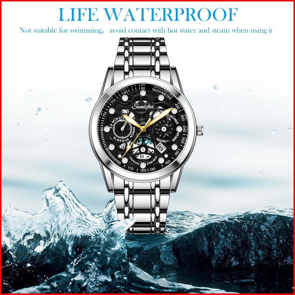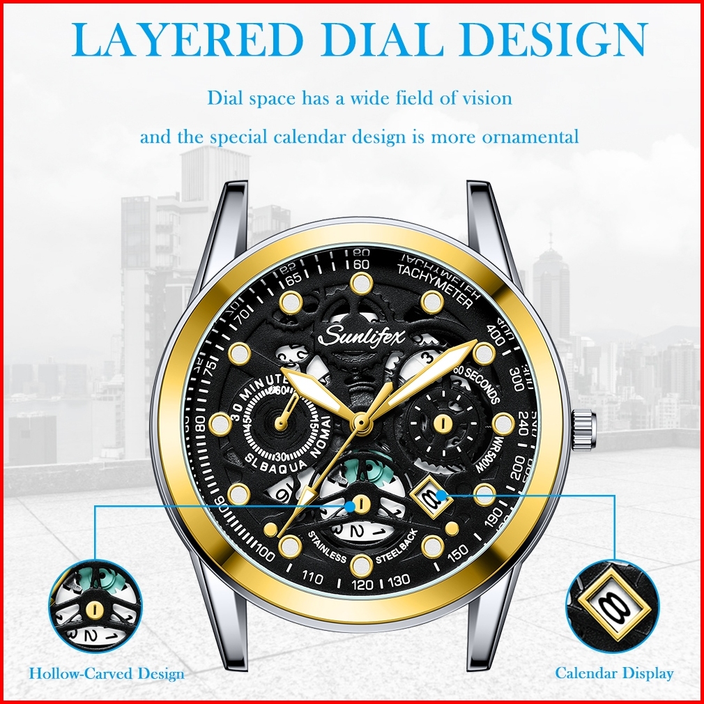 Sunlifex 9001 Jam Tangan Pria Anti Air Tampilan Ukiran Berongga Fashion Gaya Bisnis Tampilan Bercahaya Tali Stainless St