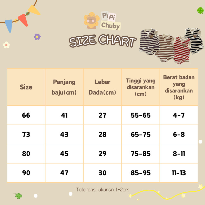PIPI CHUBY - Pakaian Bayi | Jumper Anak 0-2 Tahun | Baju Bayi Romper Tanpa Lengan Garis Stripe Dengan Bordir Beruang