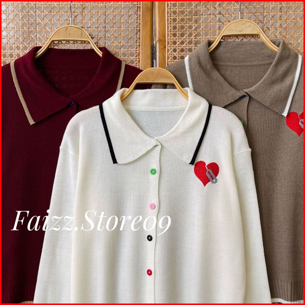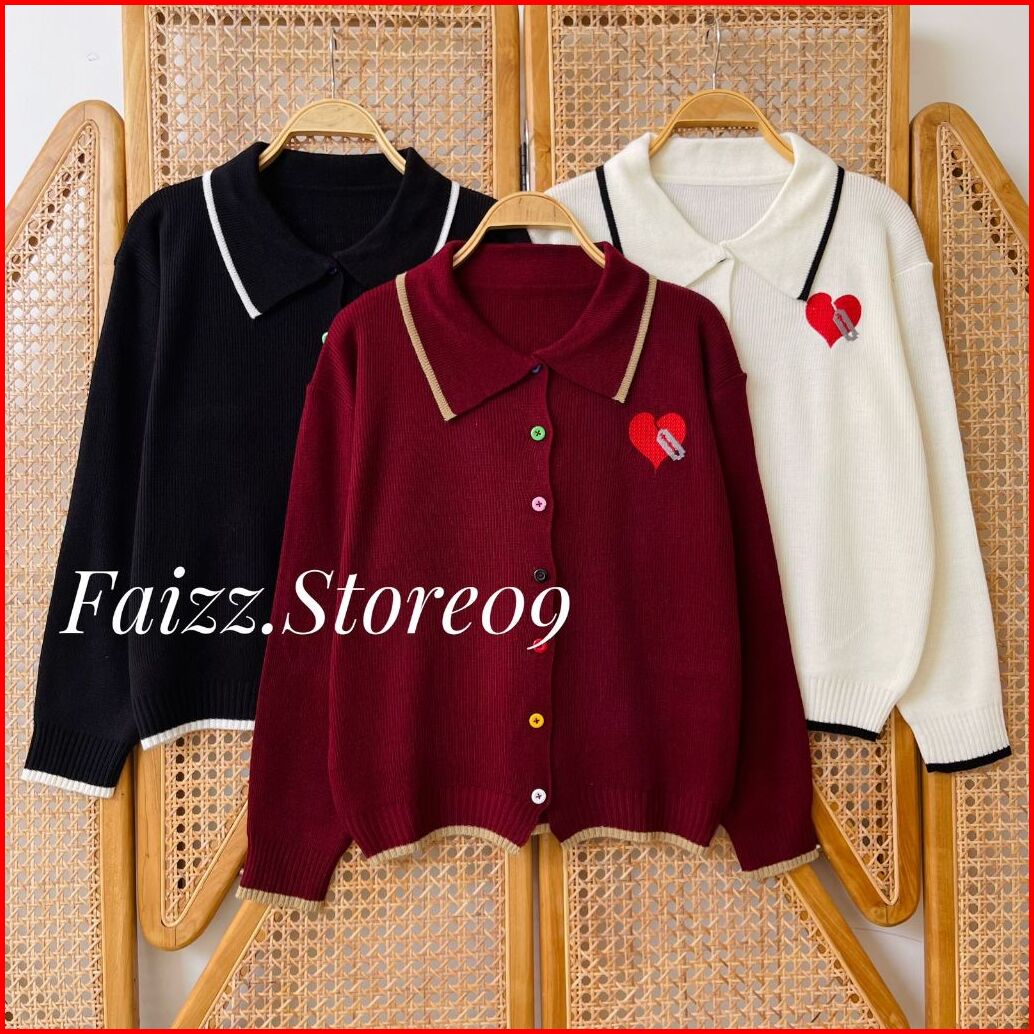 Zovia Cardy Knitwear - Atasan Cardigan Rajut Wanita Kancing Pelangi Kerah Polo Motif Bordir Love Lucu Korean Style Premi