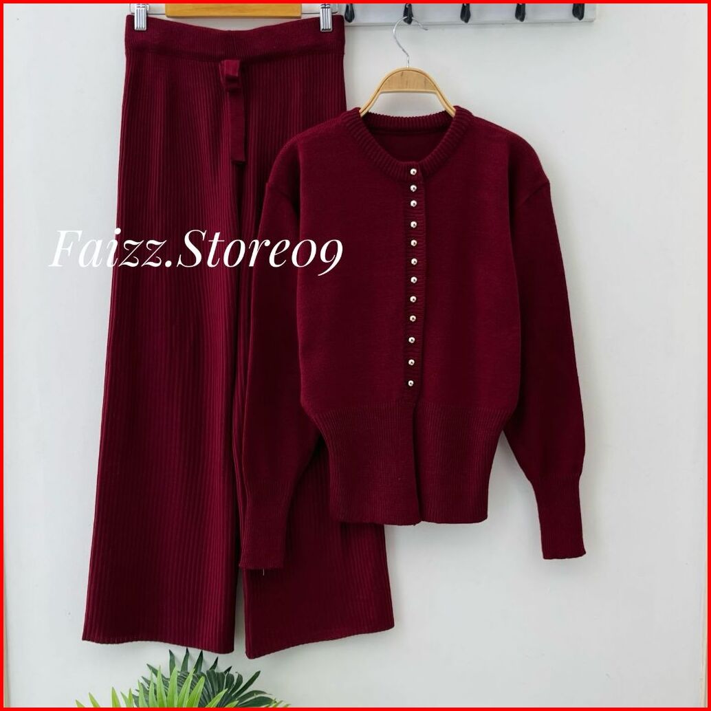 Oneset Maria Cardigan Rajut Kancing Setelan Celana Kulot Premium Wanita Lengan Panjang Kekinian