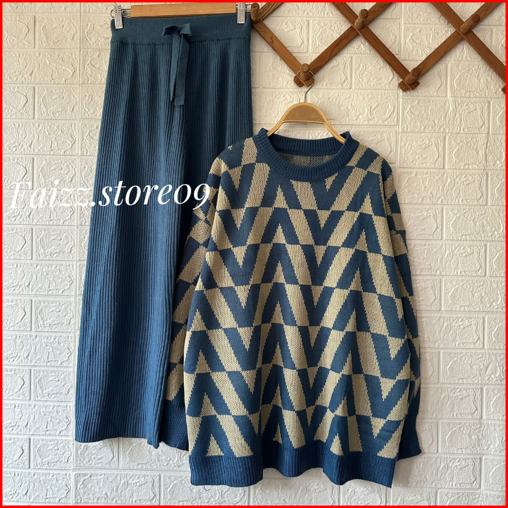 Oneset A55 Giva Knit Sweater Oversize Setelan Celana Kulot Rajut Wanita