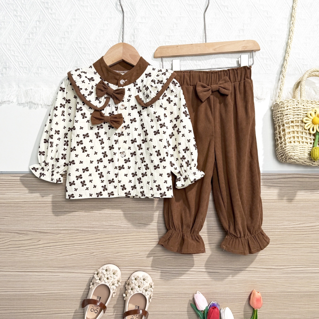 JoyfulTots Setelan Anak Gaya Korea Atasan Bunga Pita Gaya Barat Celana Kasual Anak Perempuan Set