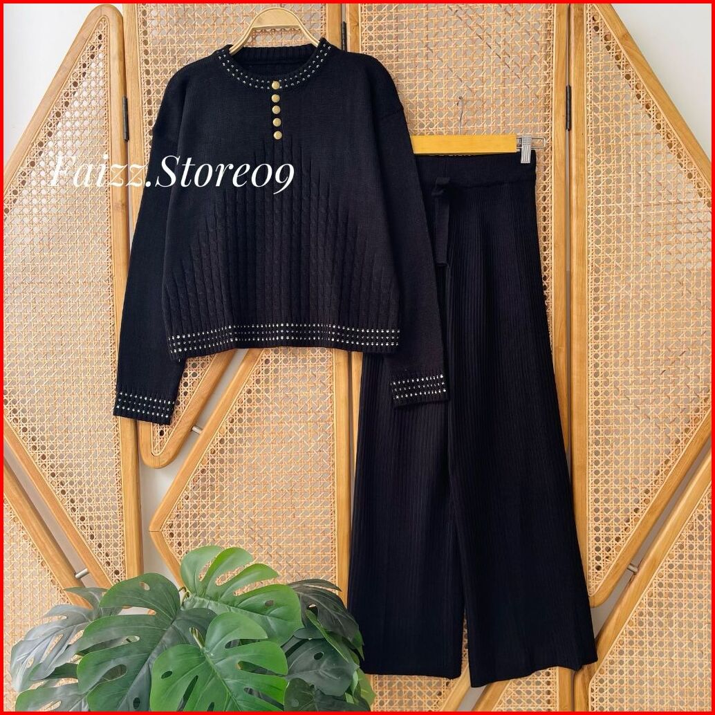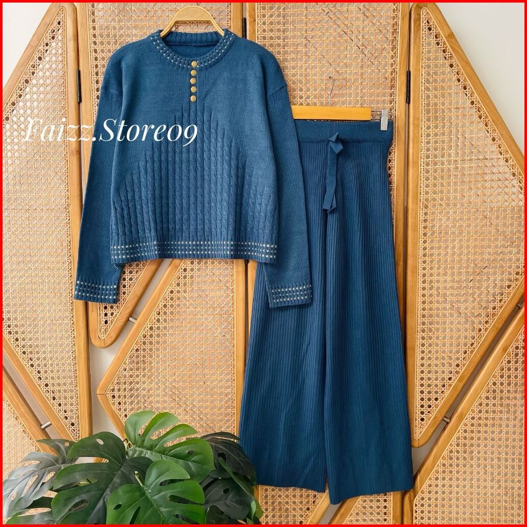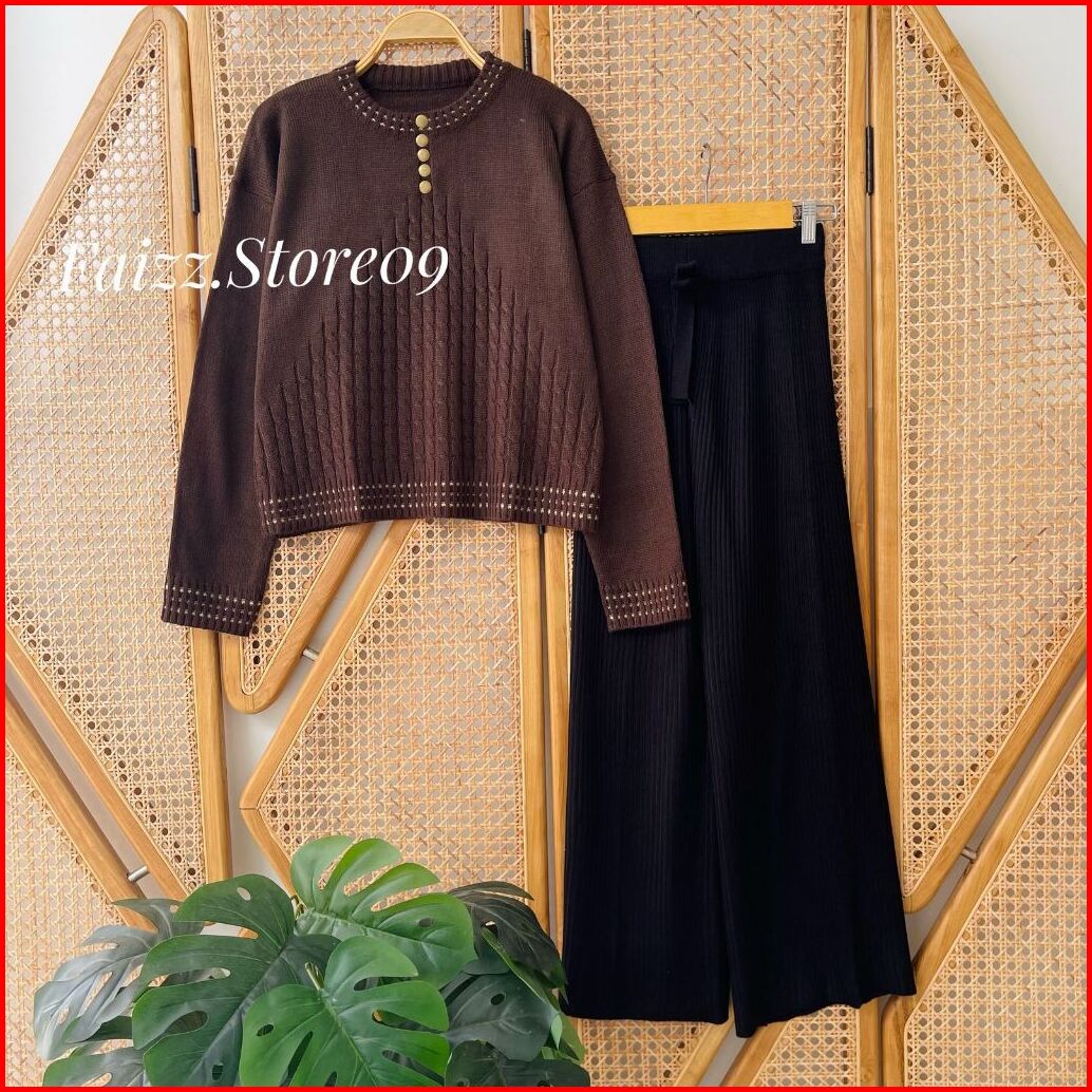 Oneset Akura Sweater Rajut Motif Cable Kancing Setelan Celana Kulot Premium Wanita Lengan Panjang Kekinian