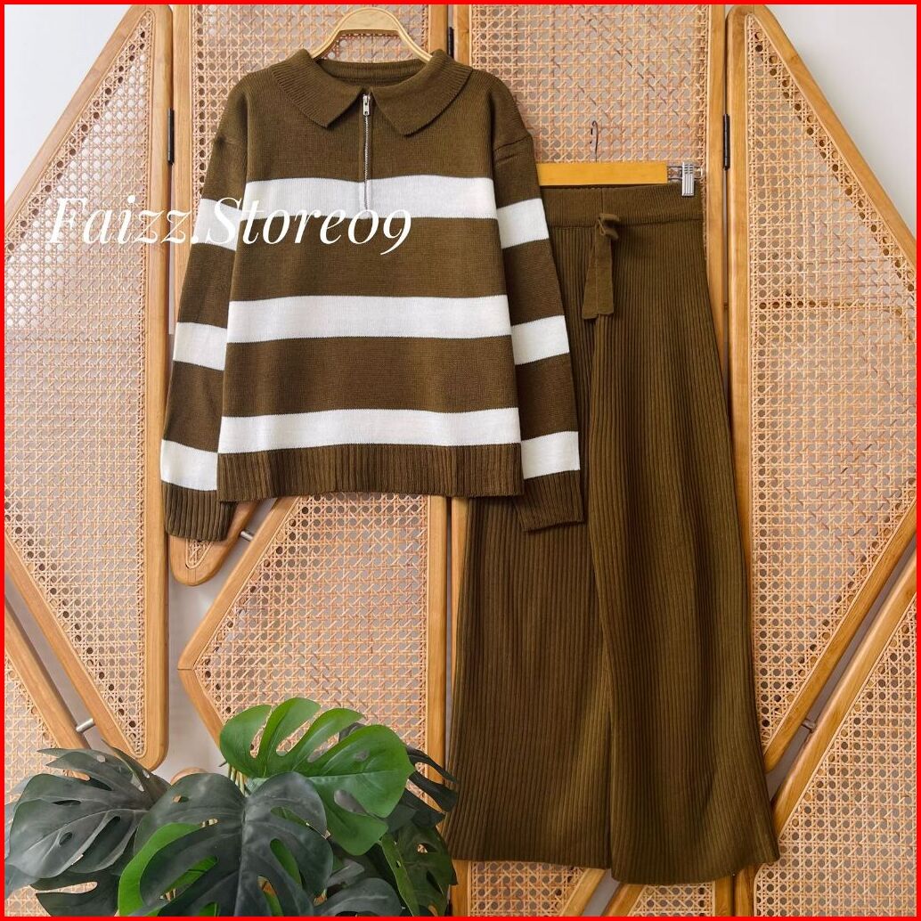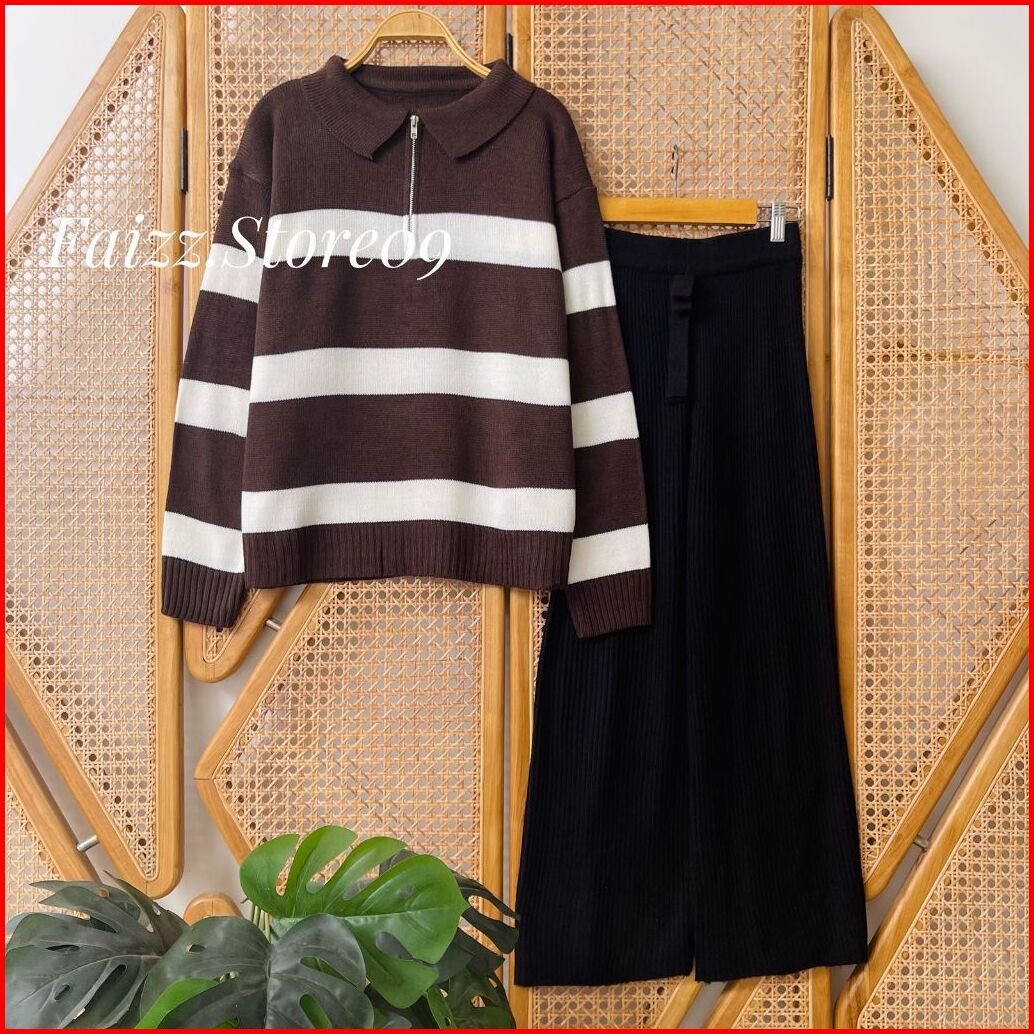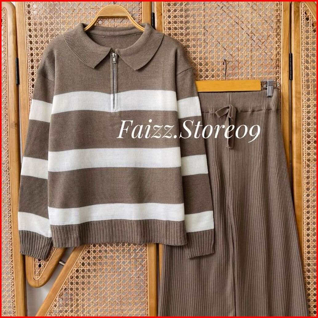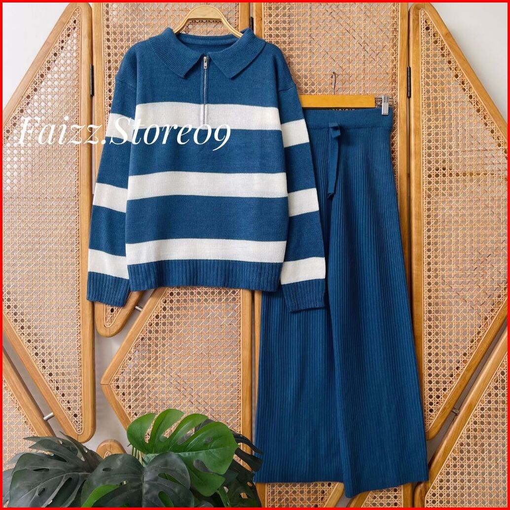 Oneset Aisma Sweater Rajut Motif Stripe Blaster Resleting Setelan Celana Kulot Premium Wanita Lengan Panjang Kekinian