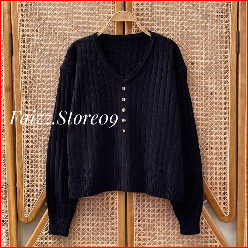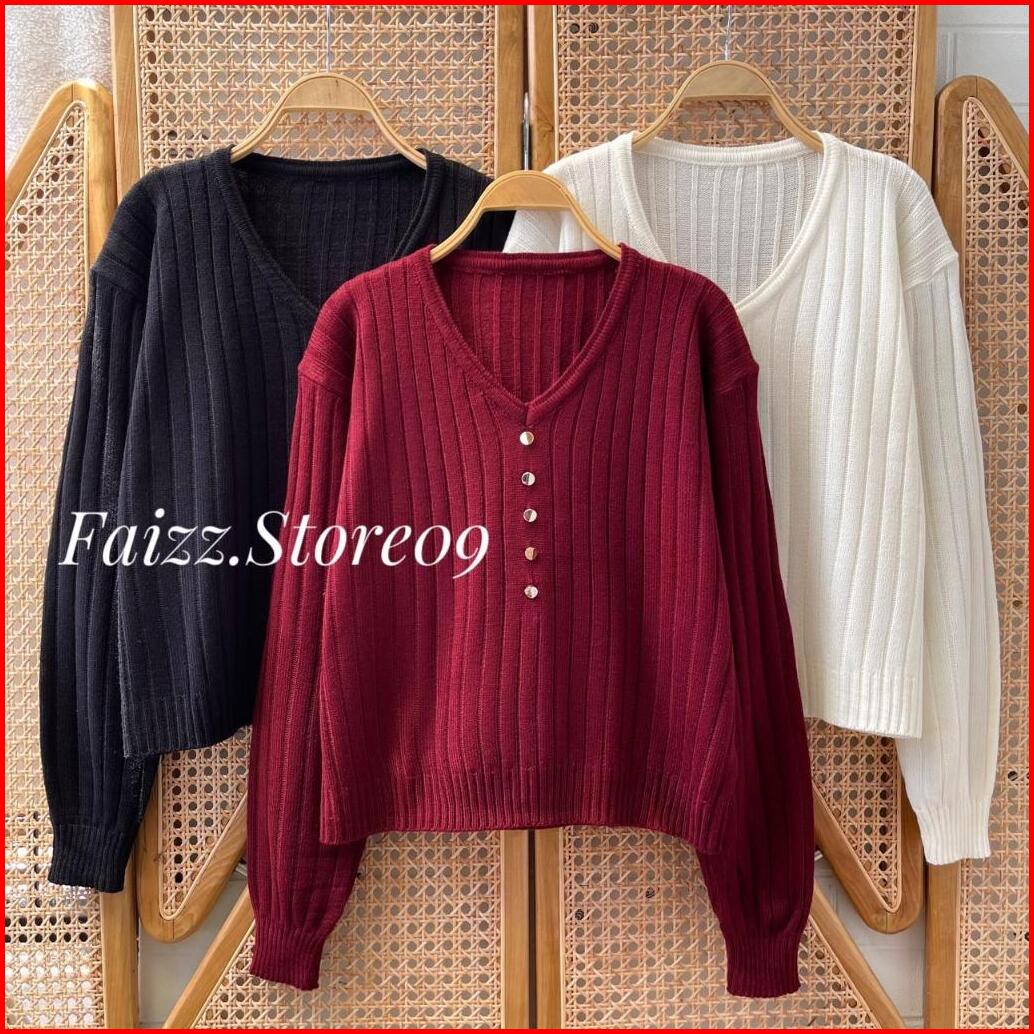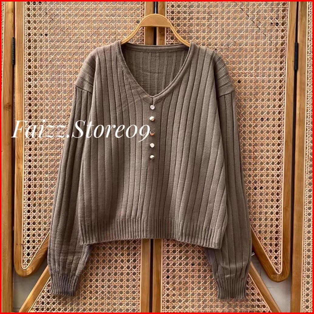 Ladea Atasan Sweater Rajut Kerah V-neck Wanita Motif Salur Kancing Korean Style Premium
