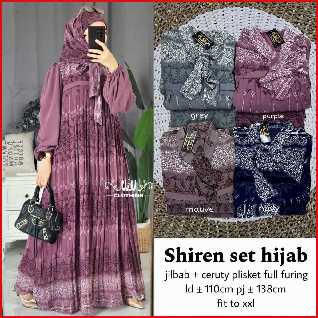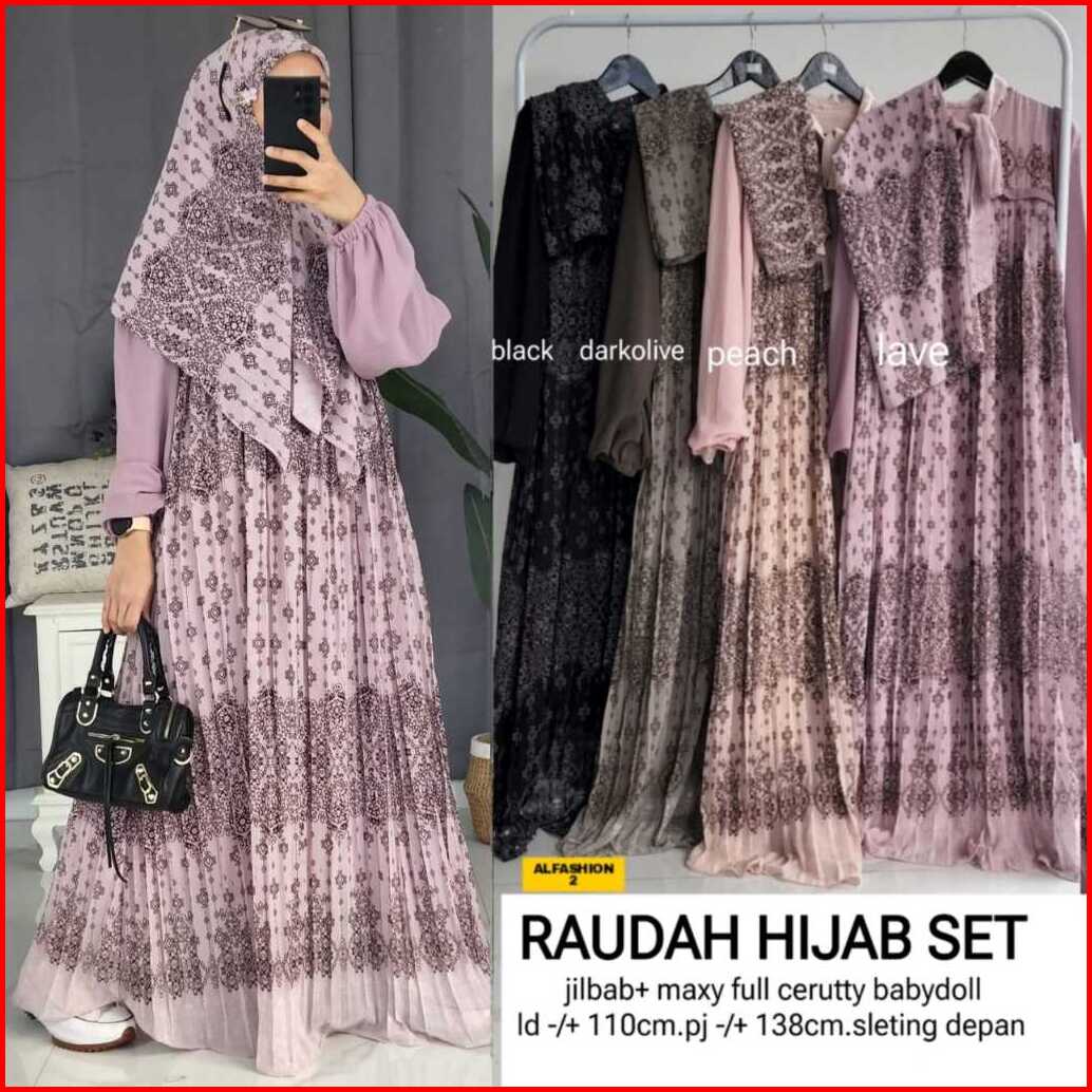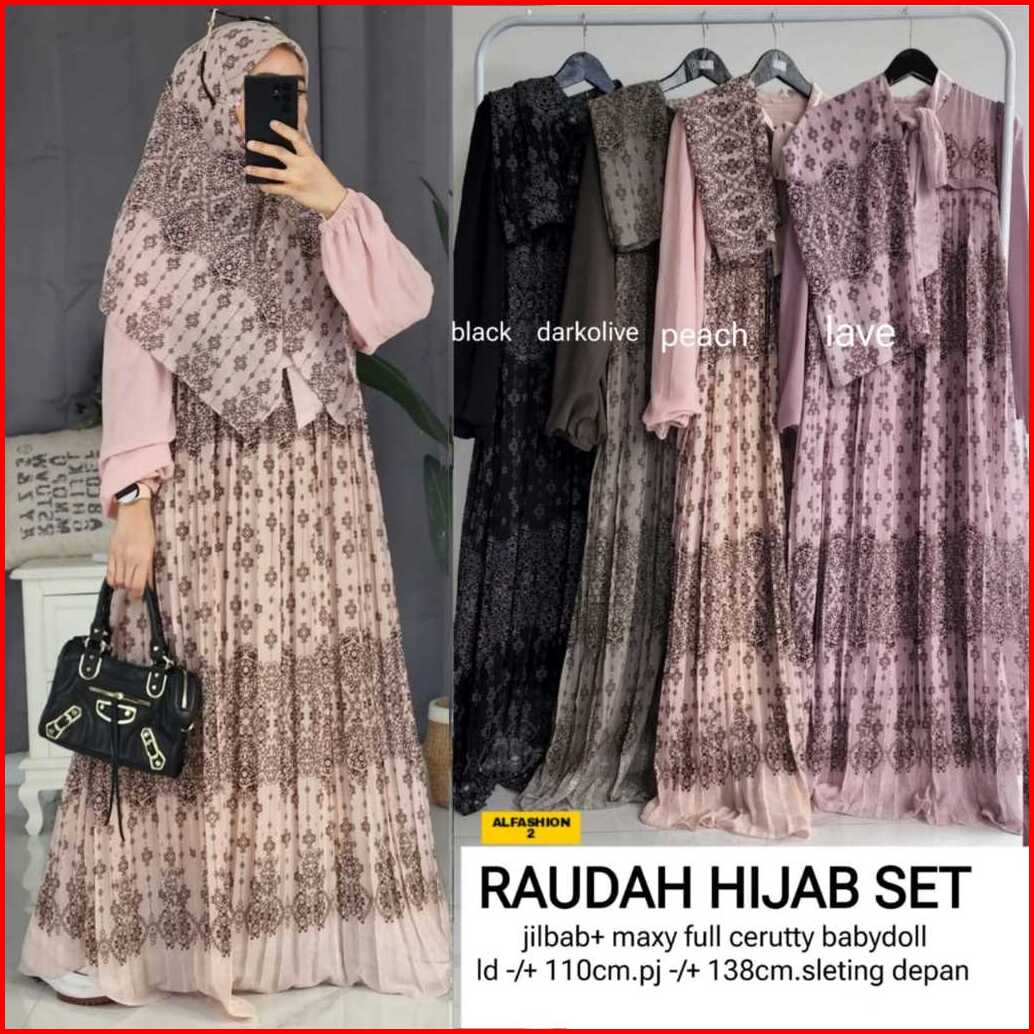 Raudah Shiren Asiqa Hijab Set Gamis Motif Ceruty Ld 110cm Pj 137cm Sleting Depan Full Furing