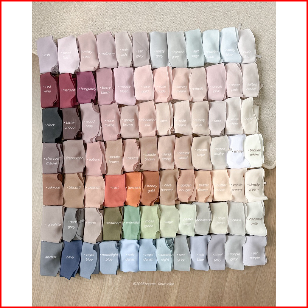 Black, Navy, Dark Grey, Earth, Eucalyptus, Cream Sage, Vanilla Cream, Misty Grey, Salt Sage, Savory Cream, Pearl Lilac, Woodrose, Creole Pink, Oyster, Bitter Choco, Salted Cream, Broken White, Soft Denim, Royal Blue, Nude Cream, Purple Grey, Sage, Frappucino, Earl Grey, Steel Grey, Powder Blue, Saddle Brown, Rose Nude, Auburn (New), Edelweiss, Rust, Soya Bean, Seaweed, Misty Rose, Sand, Pastel Sage, Snow White, Ash Grey, Graphite, Turmeric, Irish, Moonlight Blue, Summer Night, Royal Denim, Baby Denim, Maroon, Biscotti, Honey Gold, Emerald, Coconut Milk, Vanilla Blush, Candy Blue, Nude Lilac, Rosegold, Simply Cream, Sheer Pink, Ash Purple, Burgundy, White, Buttercream, Guava, Sea Grey, Oyster Grey, Pale Ash, Bone, Chalk Beige, Latte, Sandstone, Peanut, Cinnamon Tea, Olive Harvest, Greige Brown, Redwine, Ash Blue, Anchor, Rose Truffle, Faded Grey, Pale Rose, Muted Khaky, Oatmilk, Almond Sage, Berry Blush, Mauve Blush, Moss Green, Luxe Emerald, Mulberry, Birch, Smoke Grey