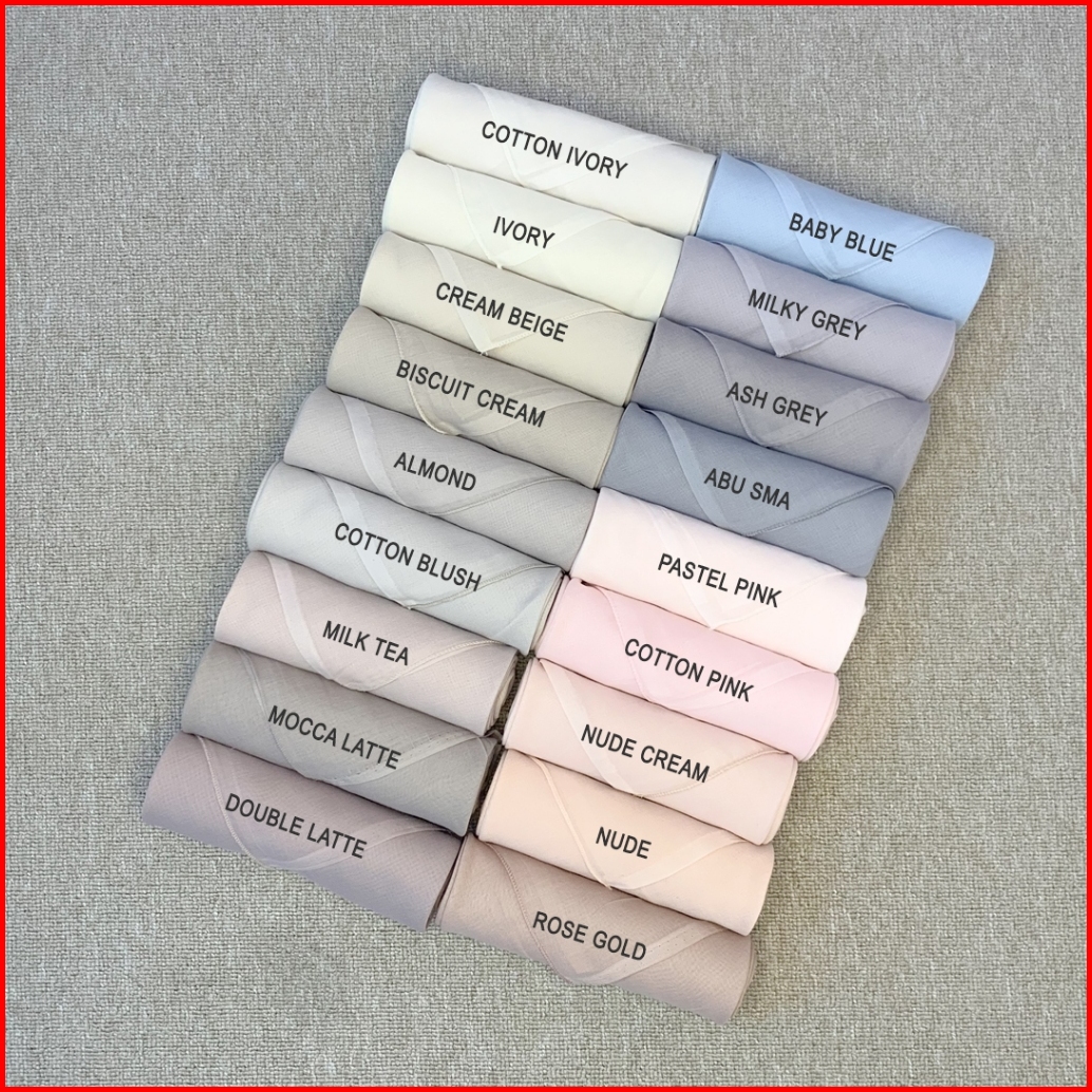 COTTON IVORY, COTTON BLUSH, TAUPE, MILKY GREY, SOFT LATTE, SOFT COKSU, OAT, MILK TEA, ALMOND, CREAM BEIGE, IVORY, COTTON BEIGE, FRENCH VANILLA, BISCUIT CREAM, TAN., MOCCA LATTE, LATTE NUDE, BISKUIT, KHAKY, BLUSH PURPLE, COTTON PINK, PASTEL PINK, NUDE PINK, DUSTY LILAC, ROSE LILY, NUDE, NUDE CREAM, BLUSH ROSE, FRAPPE, DARK ASH, ASH GREY, ABU SMA, SOFT BLUE, NAVY, HITAM., SUPER GREY, PUTIH., BROKEN WHITE, BABY BLUE, DENIM, BABY MINT, EMERALD BLUE, MATCHA, ARMY, BOTOL, DARK MAUVE, MAUVE, DEEP BERRY, MAHOGANY, DARK MAHOGANY, COKLAT PRAMUKA, MAROON, DARK MARRON, BURGUNDY, DUSTYMILO, MILO