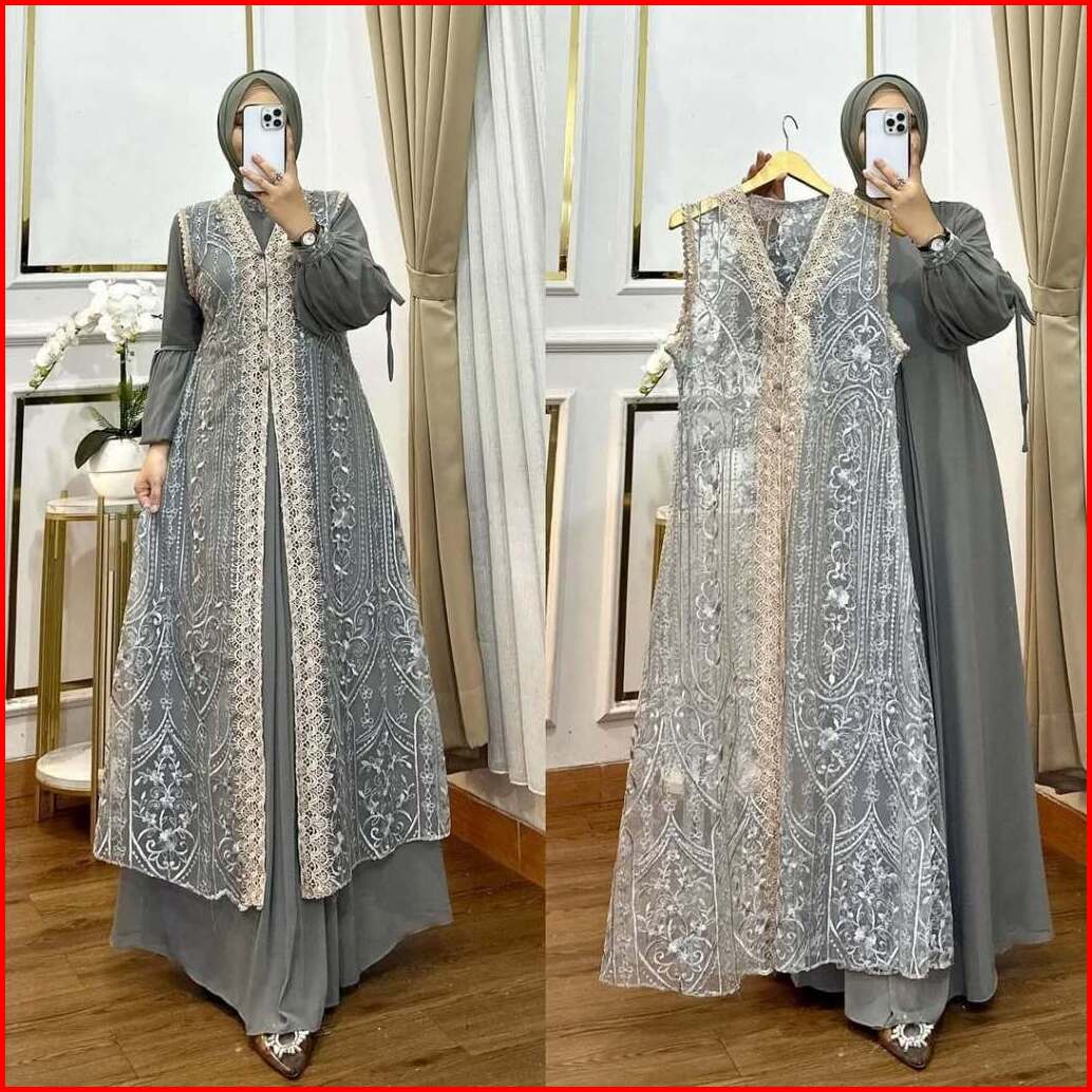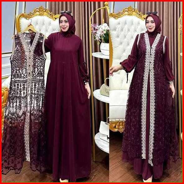 Naura Dress Gamis Brukat Set Outer Dan Iner Bahan Ceruty Babydoll Mix Brukat Gamis Pesta Mewah
