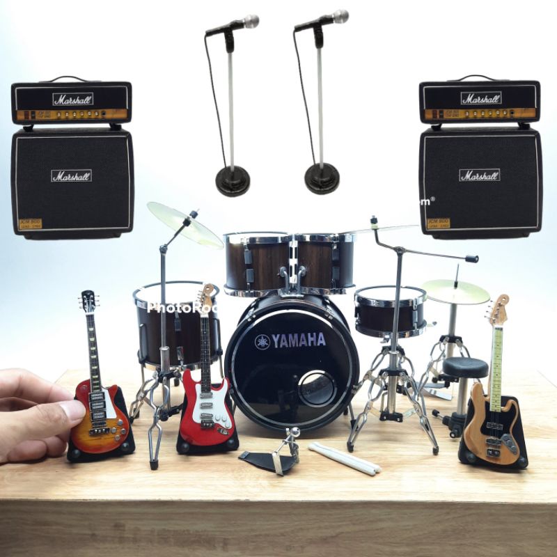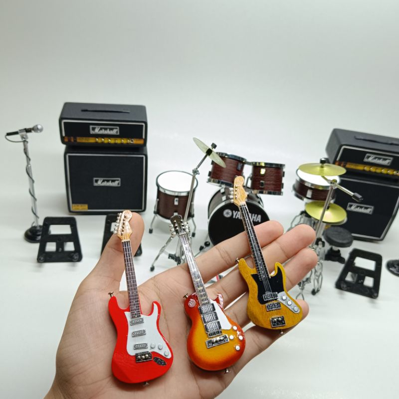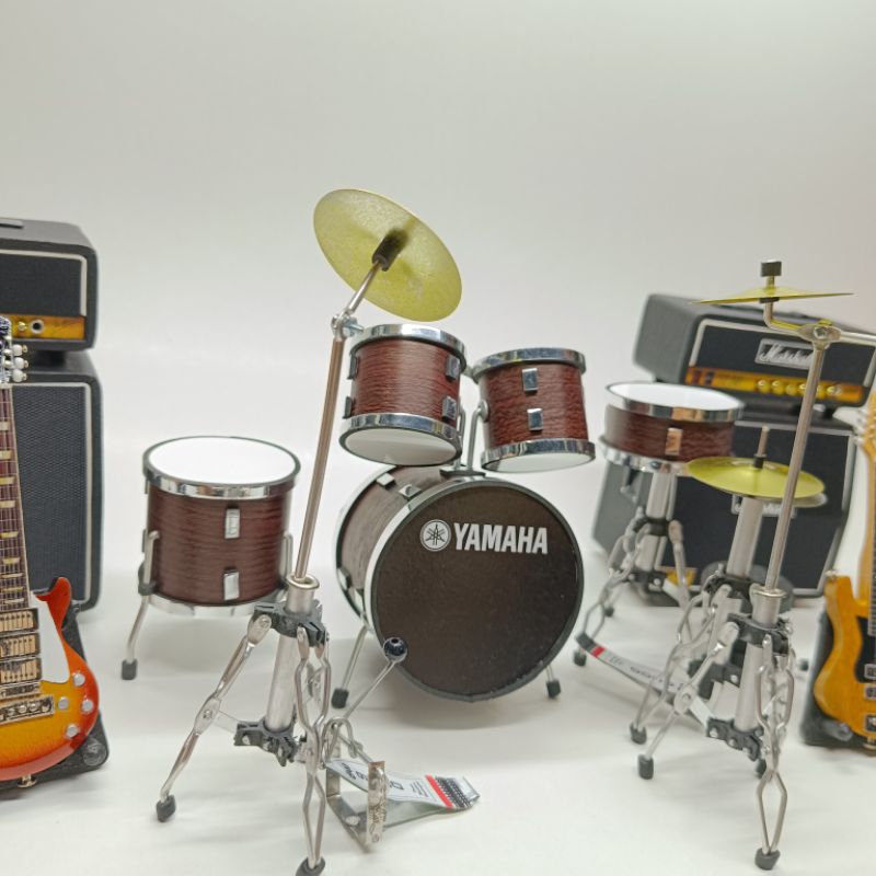 miniatur drum set YAMAHA plus gitar mini hiasan pajangan rak dinding gitar 1 : 12
