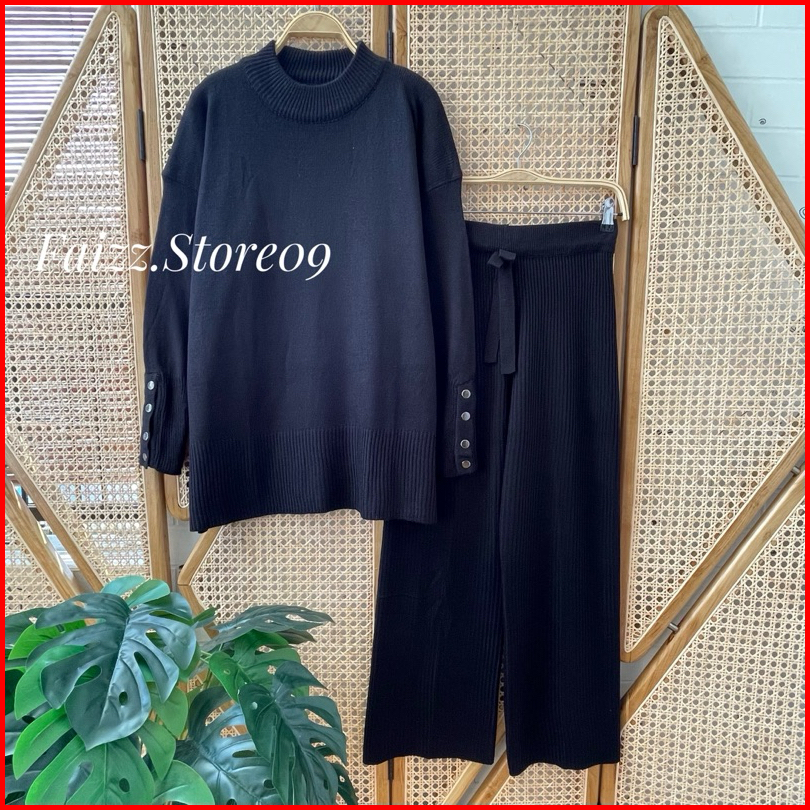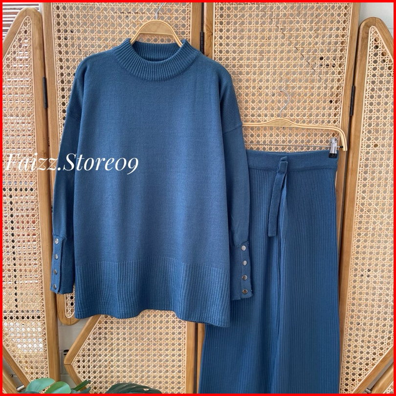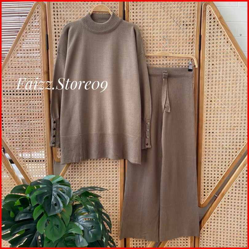 Oneset Dafa Blous Knitwear Kancing Motif Polos Setelan Celana Kulot Rajut Wanita Premium Kekinian