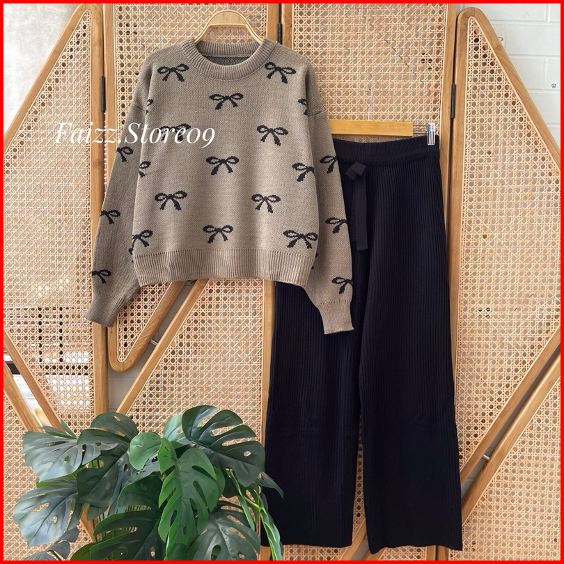 Oneset Amna Crop Top Knits Sweater Motif Pita Setelan Celana Kulot Rajut Premium Wanita Lengan Panjang Kekinian