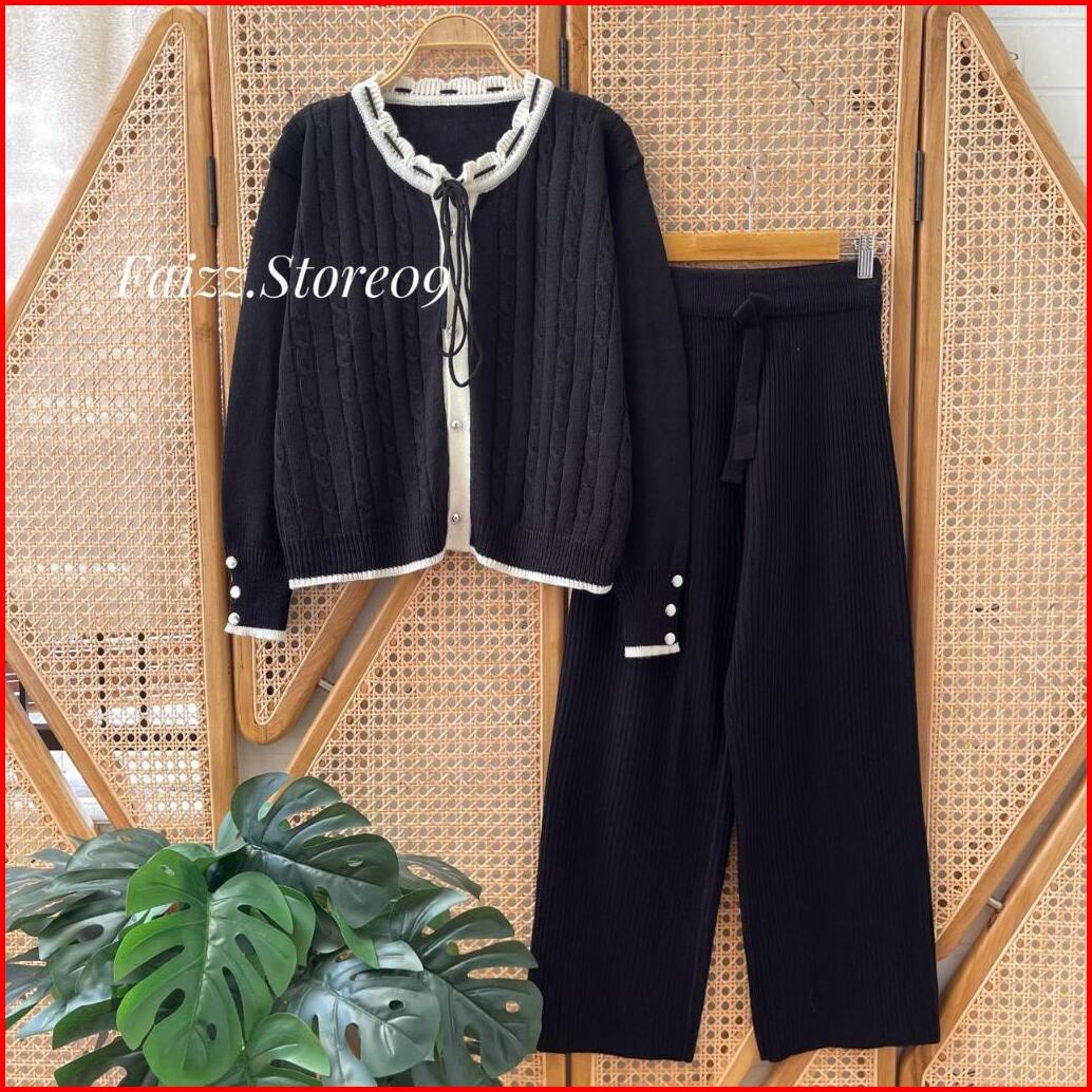 Oneset Vela Cardigan Rajut Tali Pita Motif Cable Setelan Celana Kulot Premium Lengan Panjang Wanita Kekinian