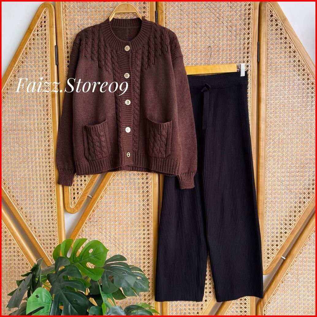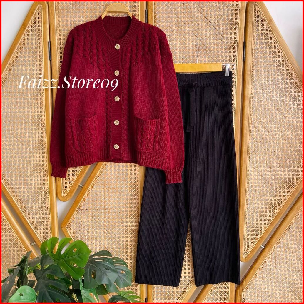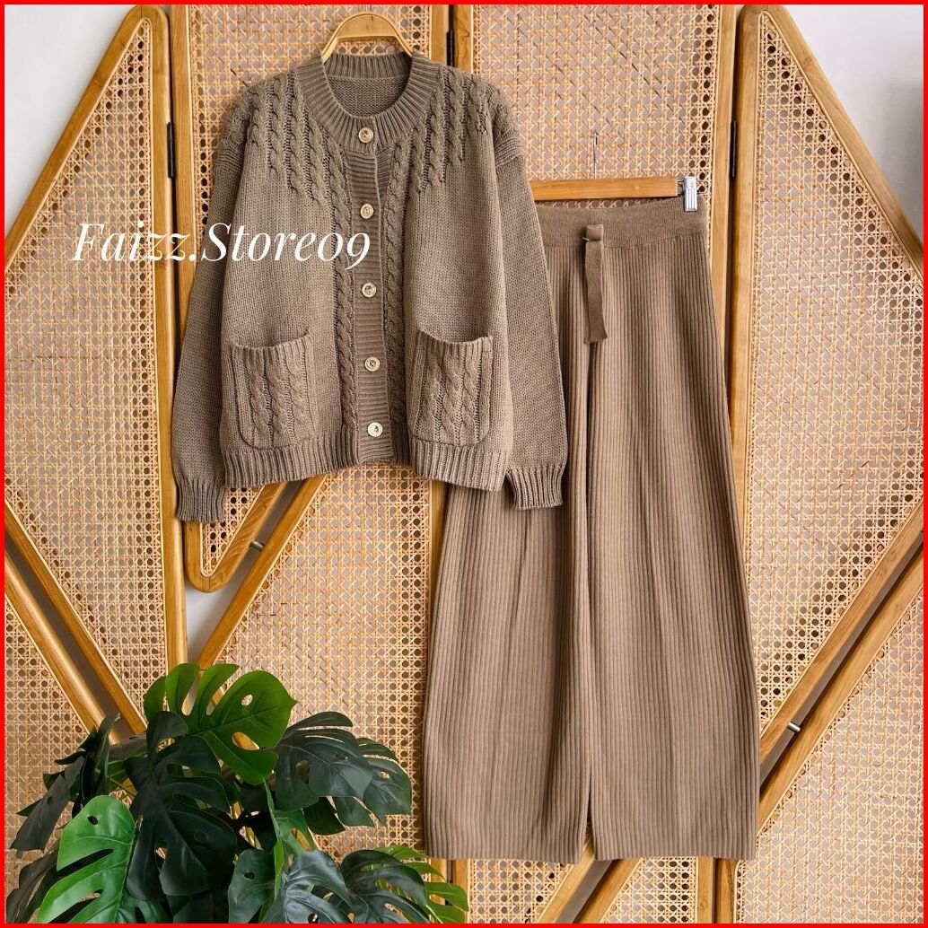 Oneset Teresia Cardigan Rajut Kancing Saku Motif Cable Setelan Celana Kulot Premium Wanita Lengan Panjang Kekinian