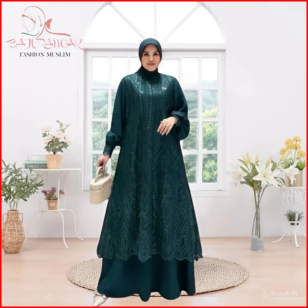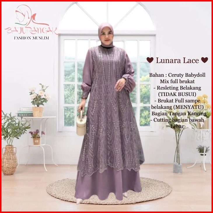 Lunarra Lace Baju Gamis Raya Wanita Muslimah Bahan Ceruty Babydoll Mix Brokat Mewah Elegan Pesta